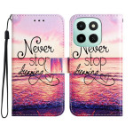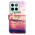 Capa elegante para carteira com o motivo inspirador "Never Stop Dreaming". Combina proteção total, funcionalidade de carteira com 3 ranhuras para cartões, suporte ajustável com várias correias e fecho magnético seguro. Inclui uma alça de mão amovível...