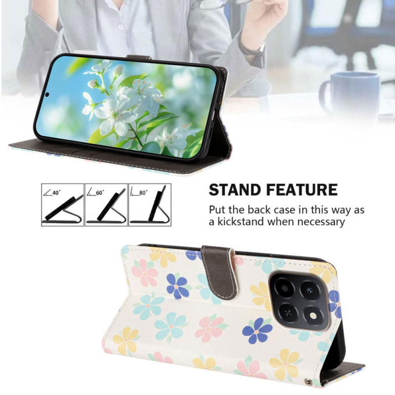 Proteja o seu Honor com estilo com este capa de carteira com um vibrante motivo floral. Com 2 ranhuras para cartões, um bolso para dinheiro e uma correia de pulso amovível, combina estilo e praticidade para uma utilização diária. A sua função de suporte torna-a ideal para uma visualização em mãos-livres.