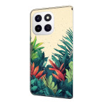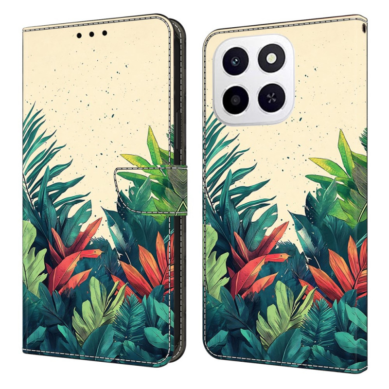Capa elegante com motivo de folhas para o Honor X6c 4G. Design de aba com suporte dobrável, 2 ranhuras para cartões e fecho magnético seguro. Proteção completa contra choques e riscos do dia a dia.