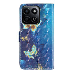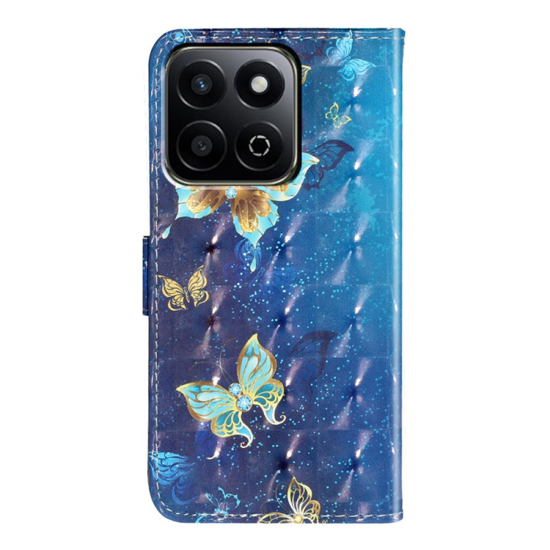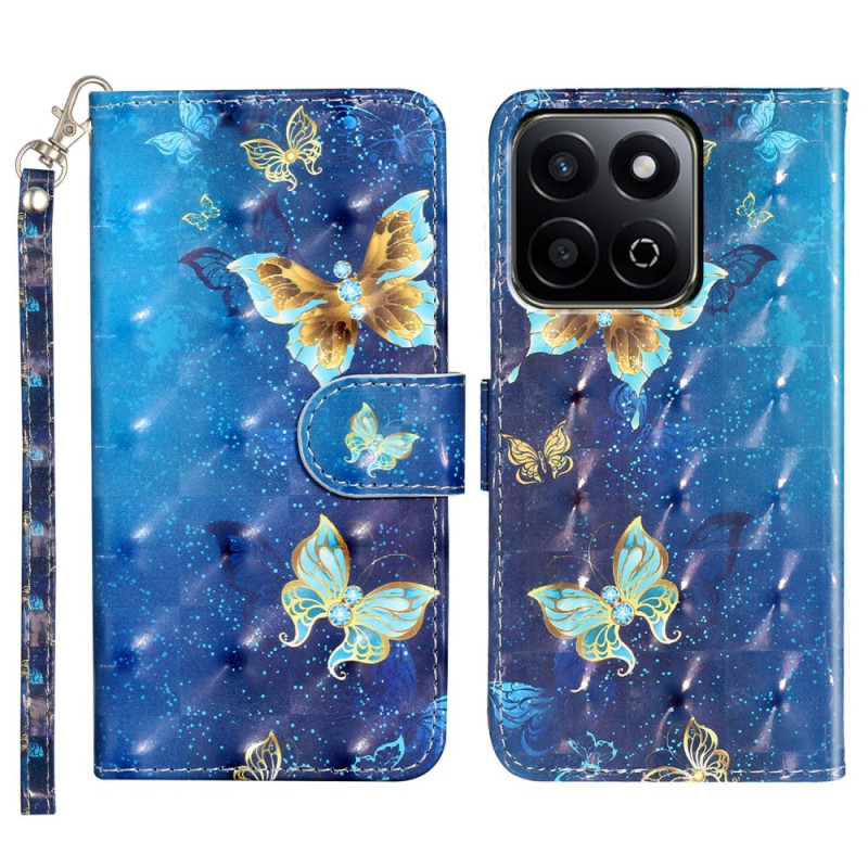 Proteja o seu Honor X7c 5G / 4G / 200 Smart 5G com estilo com esta capa para carteira com um motivo de borboleta 3D azul-dourado. Com ranhuras para cartões, um suporte ajustável e um fecho magnético seguro, combina estilo e funcionalidade. Fornecida com uma alça de mão amovível.