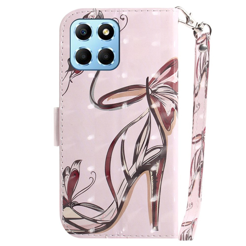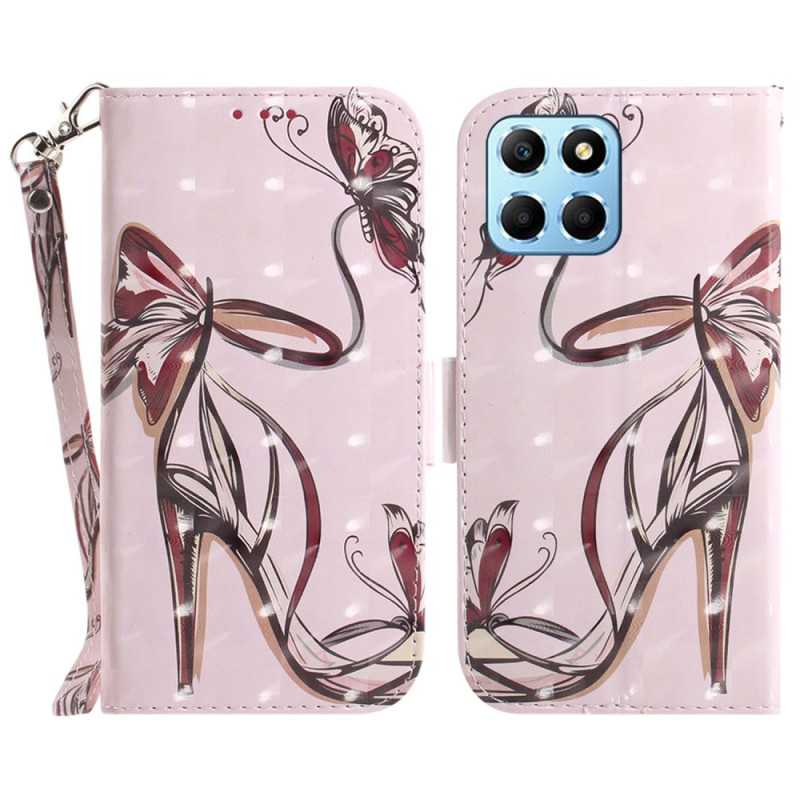 Capa elegante para carteira para o Honor X8 5G com motivos de borboleta e saltos altos. Inclui várias ranhuras para cartões, um suporte dobrável e uma prática alça de mão. Fecho magnético seguro para uma proteção completa no dia a dia.