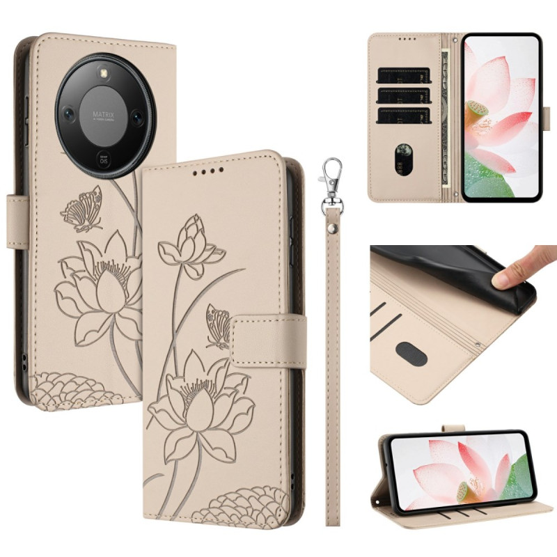 Capa elegante com motivos de lótus impressos para o Honor Magic 8 Lite 5G. Inclui várias ranhuras para cartões, um suporte dobrável e uma correia de pulso amovível para um transporte fácil e seguro.