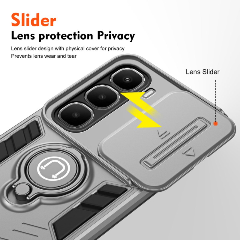 Proteção robusta em PC e TPU para o seu Infinix Hot 60 5G. Com uma inovadora tampa deslizante para a câmara, anel de suporte magnético e suporte de visualização integrado. Proteja totalmente o seu smartphone contra choques.