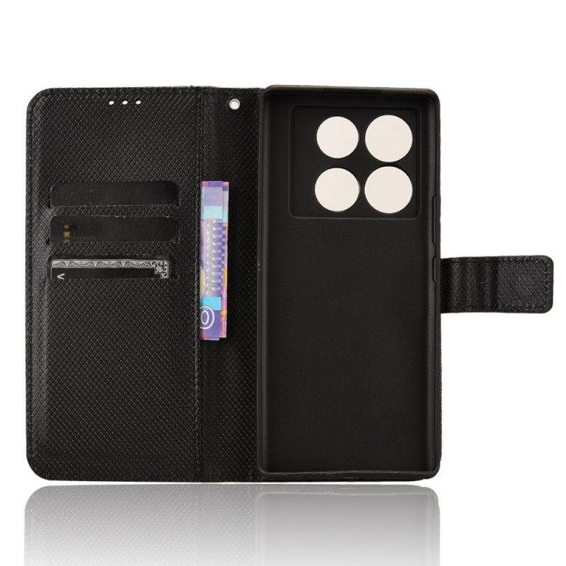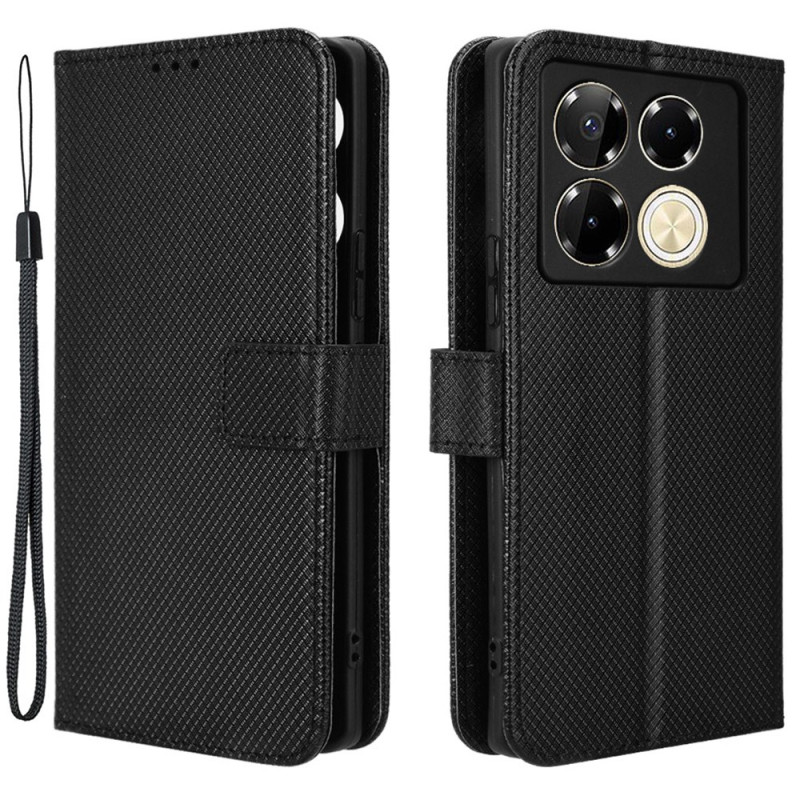 Capa elegante com textura de diamante para o seu Infinix Note 40 5G. Com várias ranhuras para cartões, suporte integrado e fecho magnético seguro. Proteção completa e estilo refinado para uso diário.