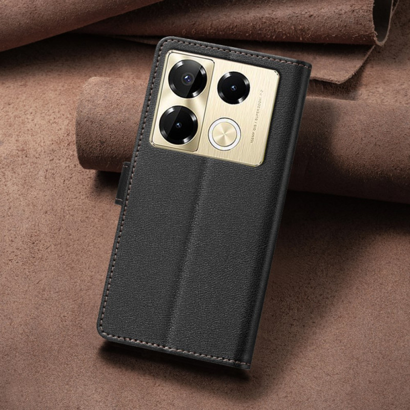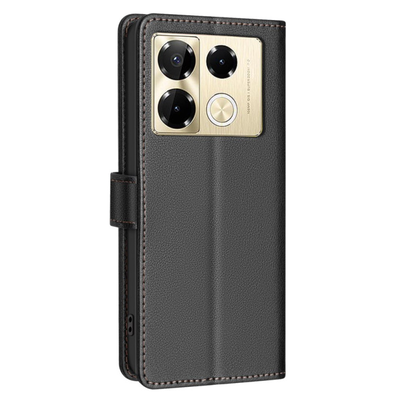 Capa elegante com suporte integrado para o Infinix Note 40 Pro 5G / 4G / 40 Pro Plus 5G. Inclui 3 ranhuras para cartões, 1 bolso para notas e tecnologia de bloqueio RFID. Fecho magnético seguro e proteção total contra choques diários.