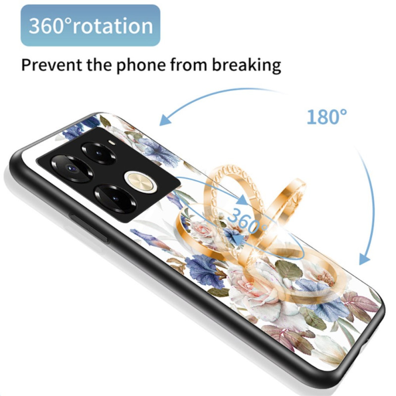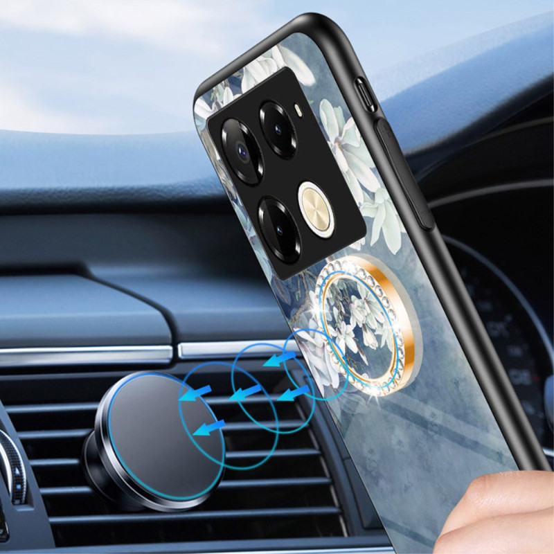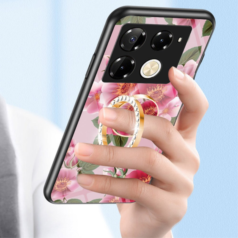 Proteja o seu Infinix Note 40 Pro 4G com esta elegante capa com motivos florais. Possui um anel de suporte dobrável com strass, uma parte traseira de vidro temperado resistente e uma placa de metal integrada para suporte magnético.