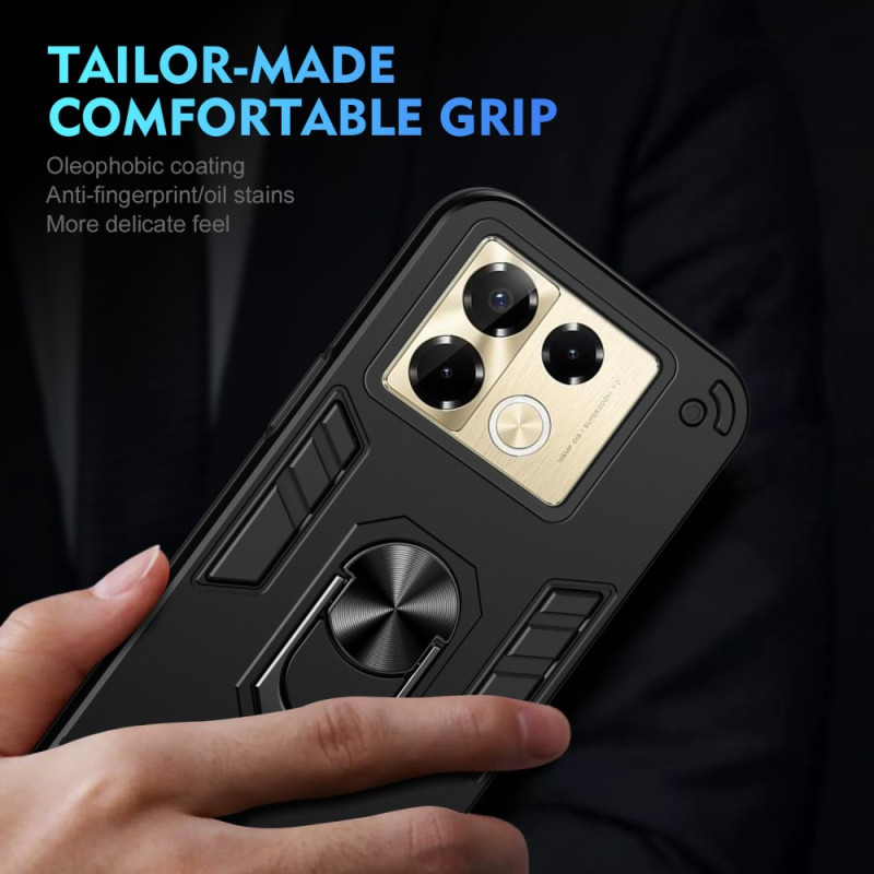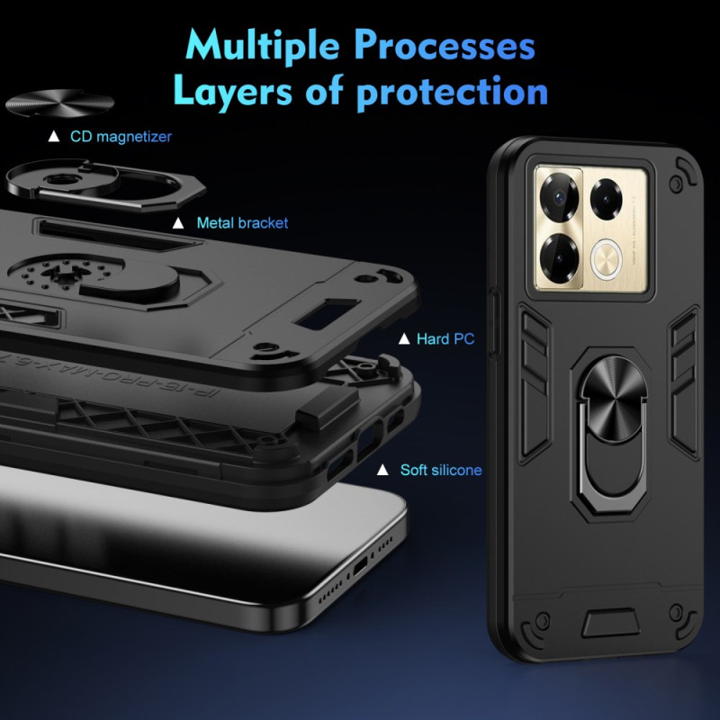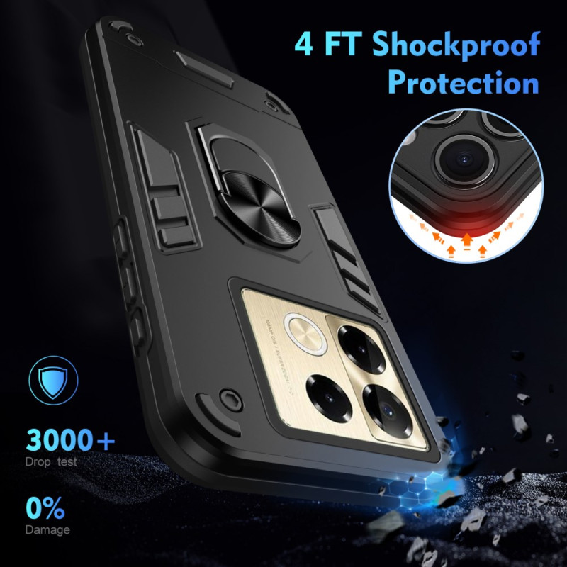 Proteja o seu Infinix Note 40 Pro 4G com esta capa robusta com um suporte rotativo ajustável e compatível com suportes magnéticos para automóvel. Concebida com rebordos elevados para uma proteção óptima do ecrã e da câmara.