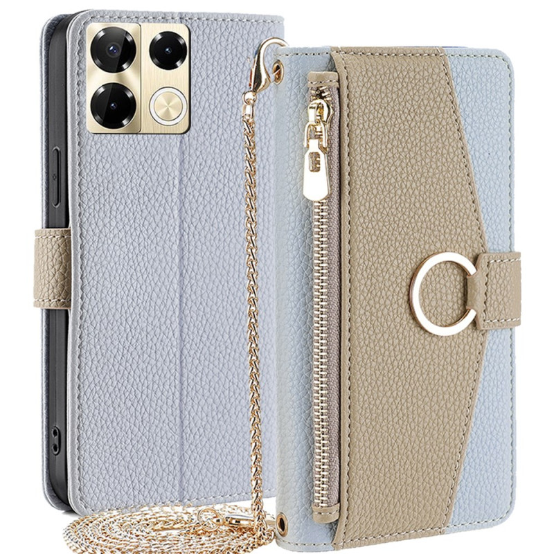 Capa elegante em pele PU para Infinix Note 40 Pro 5G. Design multifuncional com suporte para cartões, compartimento para bilhetes, fecho magnético seguro e alça de ombro amovível. Óptima proteção e praticidade no dia a dia.