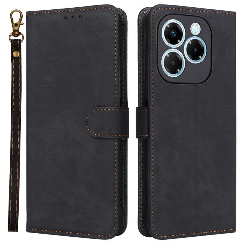 Sofisticada capa de couro PU para Infinix Note 40X 5G. Proteção RFID integrada, 3 ranhuras para cartões e carteira. Suporte ajustável para mãos livres e fecho magnético seguro. Alça de mão incluída para facilitar o transporte.