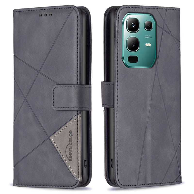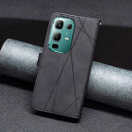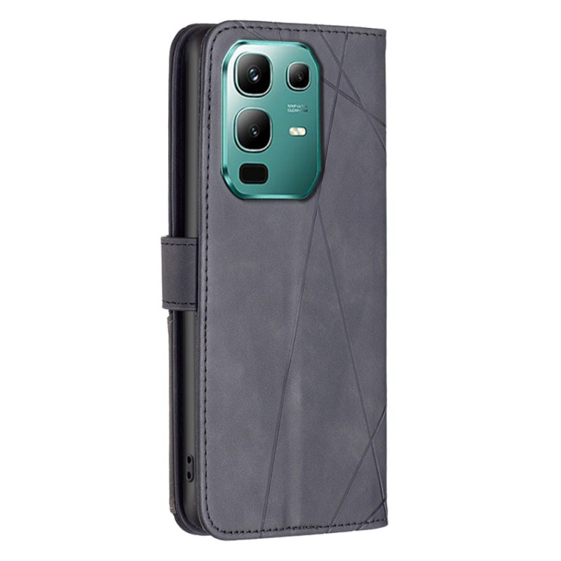 Capa tipo carteira elegante para o Infinix Note 50X 5G com suporte ajustável e design geométrico moderno. Combina proteção total e funcionalidade com 3 ranhuras para cartões e compartimento para notas. Fecho magnético seguro.