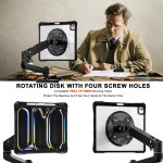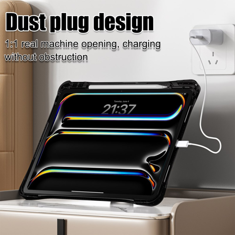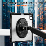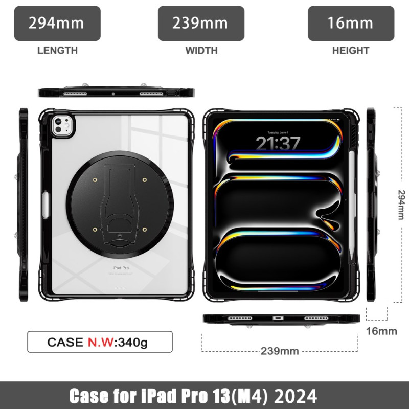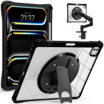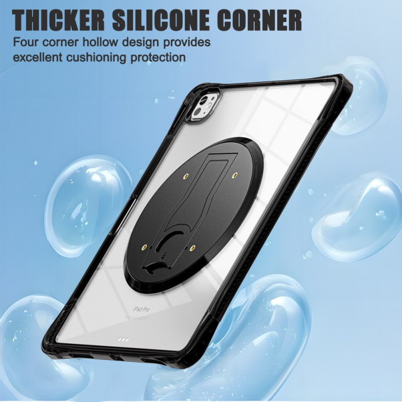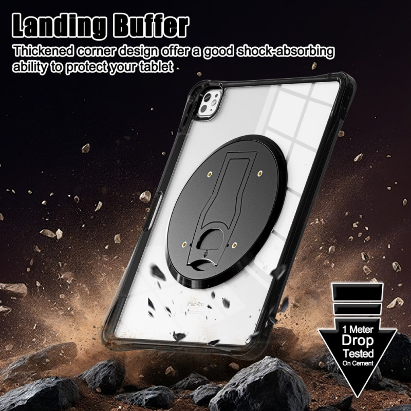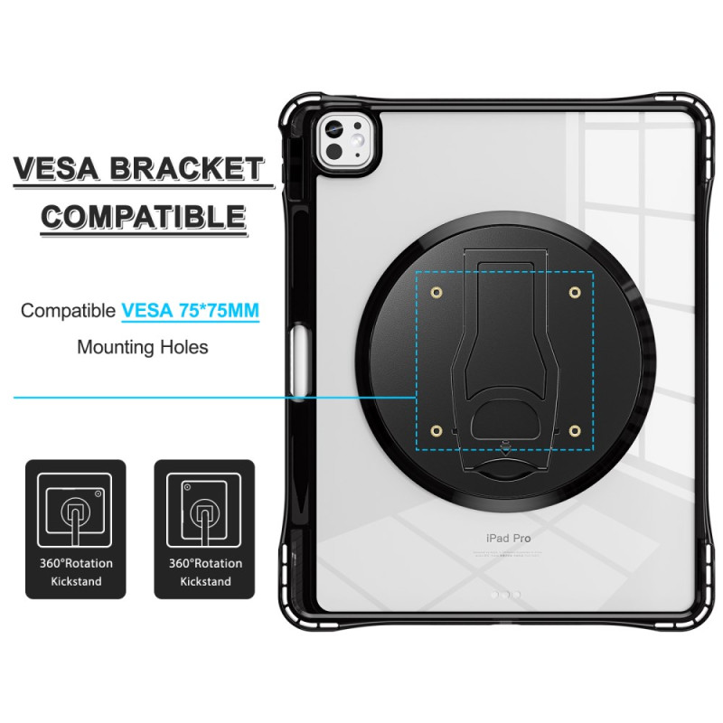 Descubra a nossa capa robusta e versátil para o iPad Pro. Com um suporte rotativo de 360°, cantos elevados para maior proteção e um design resistente ao pó. A parte traseira em acrílico transparente realça o seu tablet, proporcionando uma proteção fiável. Compatível com VESA para uma montagem fácil.
