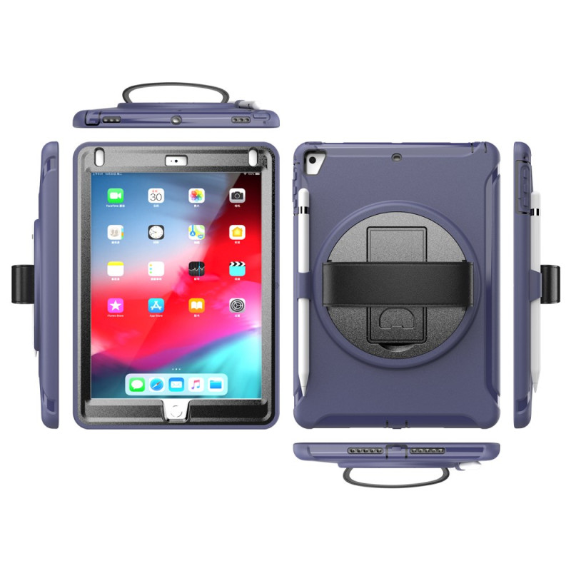 Protection complète pour iPad( 9.7 pouces) / iPad Pro 9.7 pouces / iPad Air / iPad Air 2 avec support pivotant 360°, sangle main ajustable et emplacement stylet. Conception robuste en PC et TPU avec doublure intérieure en mousse pour une protection optimale contre les chocs et les rayures au quotidien.