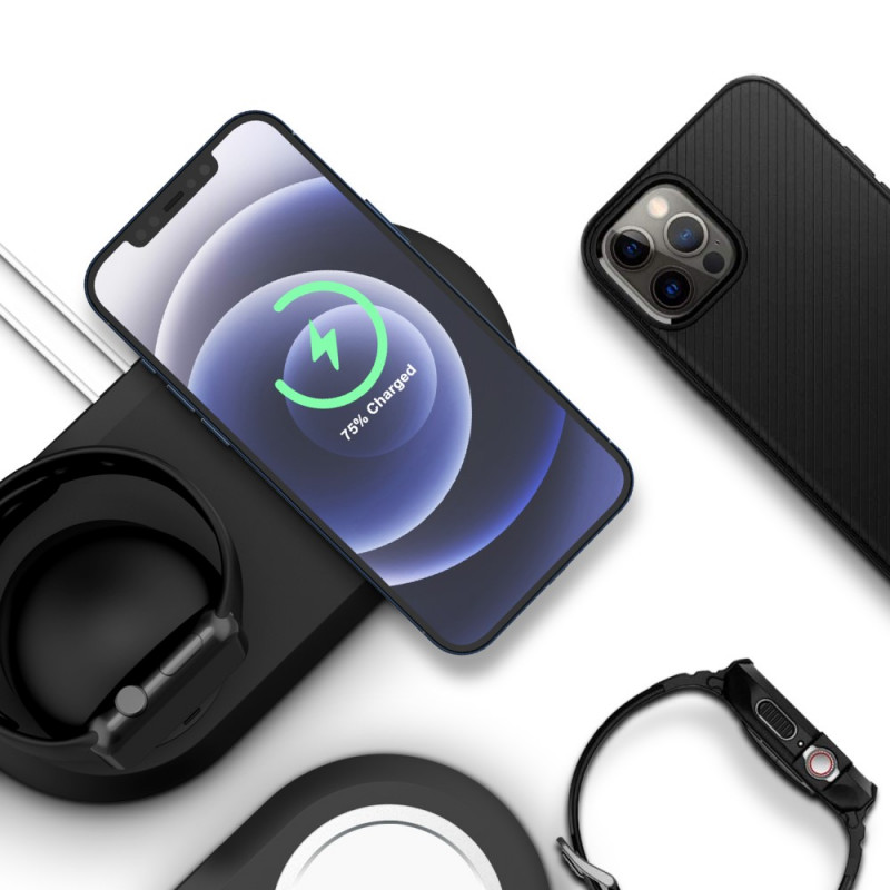 Simple et pratique, le support fait office de station de chargement MagSafe est adapté au portable et à la montre intelligente.