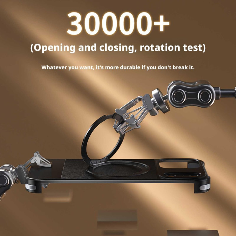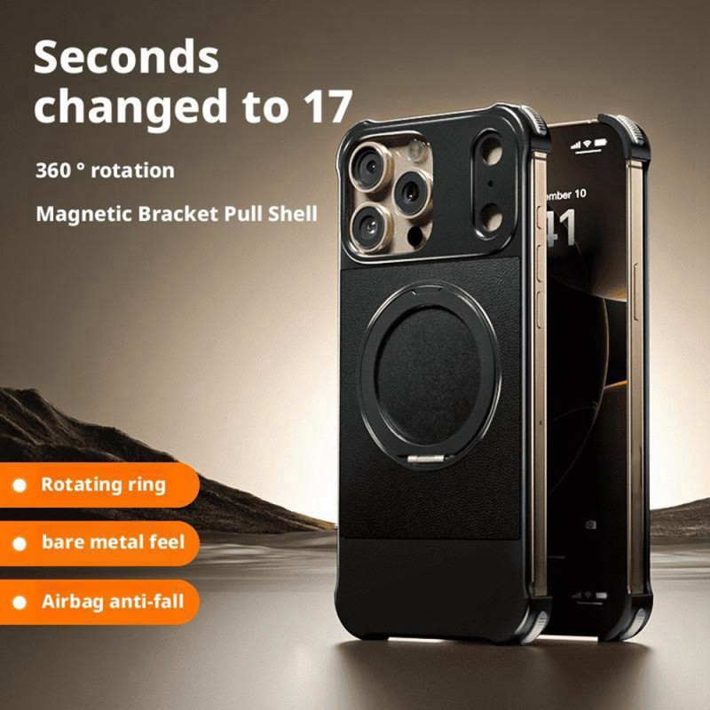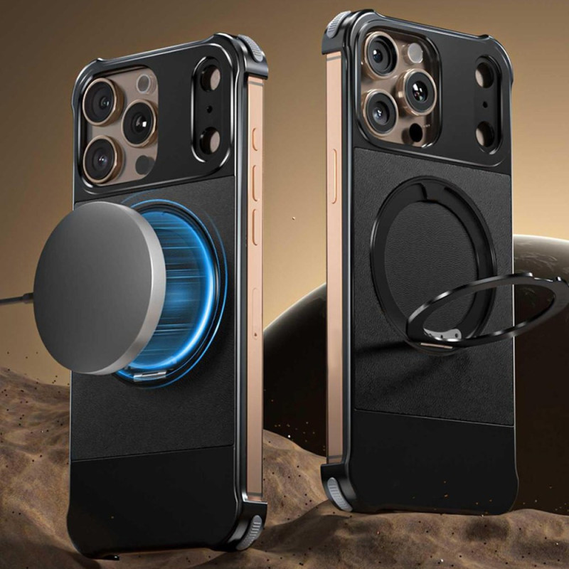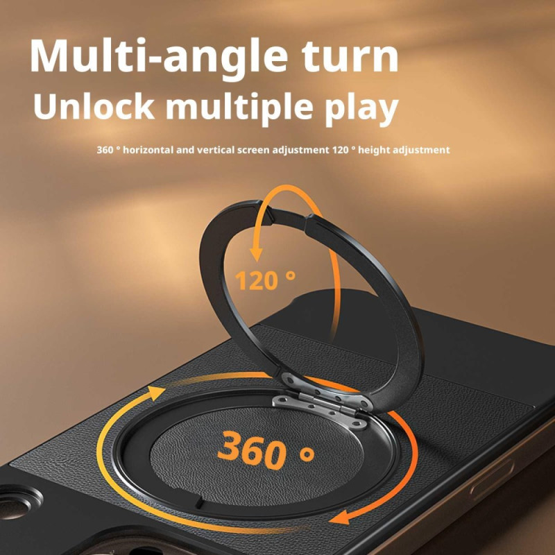 Capa magnética elegante para iPhone 13 Pro Max com suporte multifunções integrado. Compatível com MagSafe e carregamento sem fios. Design sem margens com proteção reforçada nos cantos. Fácil instalação deslizante.