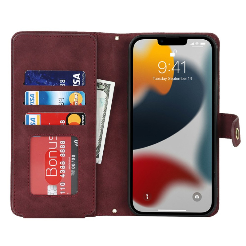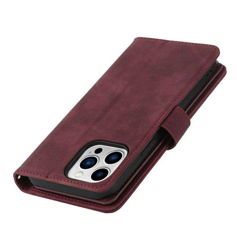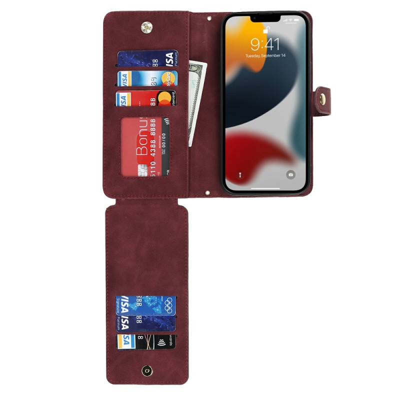 Descubra esta capa multifunções em pele PU vintage para iPhone 13 Pro Max e 12 Pro Max. Com várias ranhuras para cartões, um bolso com fecho de correr e duas alças de ombro amovíveis, combina elegância e praticidade para uma utilização quotidiana.