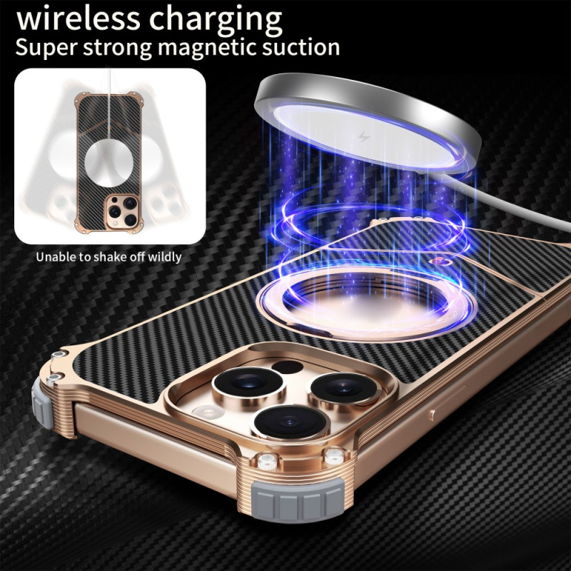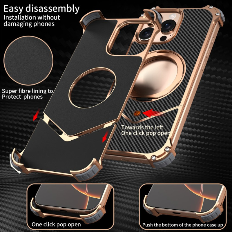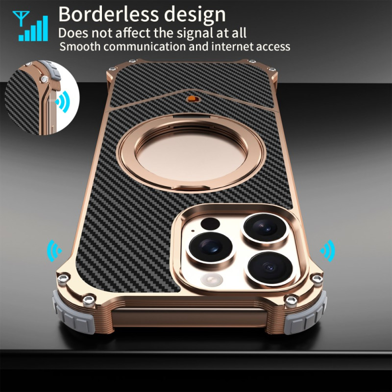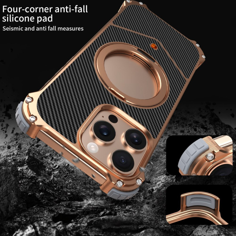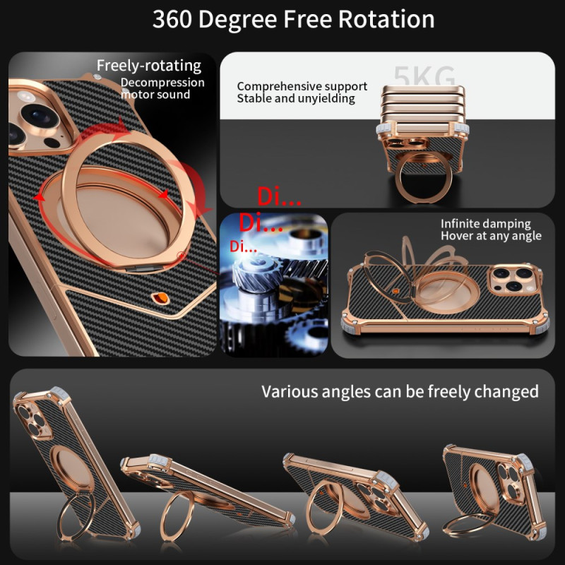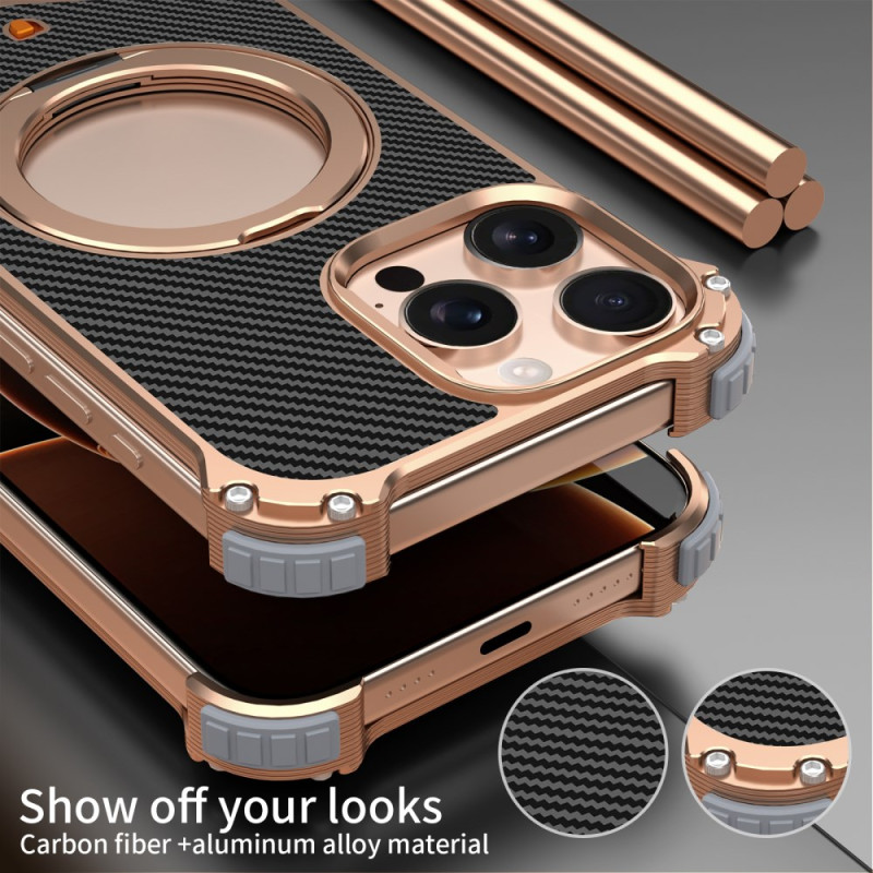 Proteja o seu iPhone 13 Pro Max com estilo com esta capa magnética com um design sem margens. Textura refinada em fibra de carbono, suporte rotativo de 360° e proteção reforçada dos cantos com almofadas de ar anti-choque. Compatível com MagSafe para um carregamento sem fios optimizado.