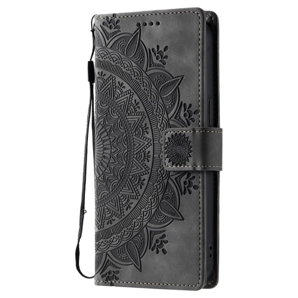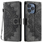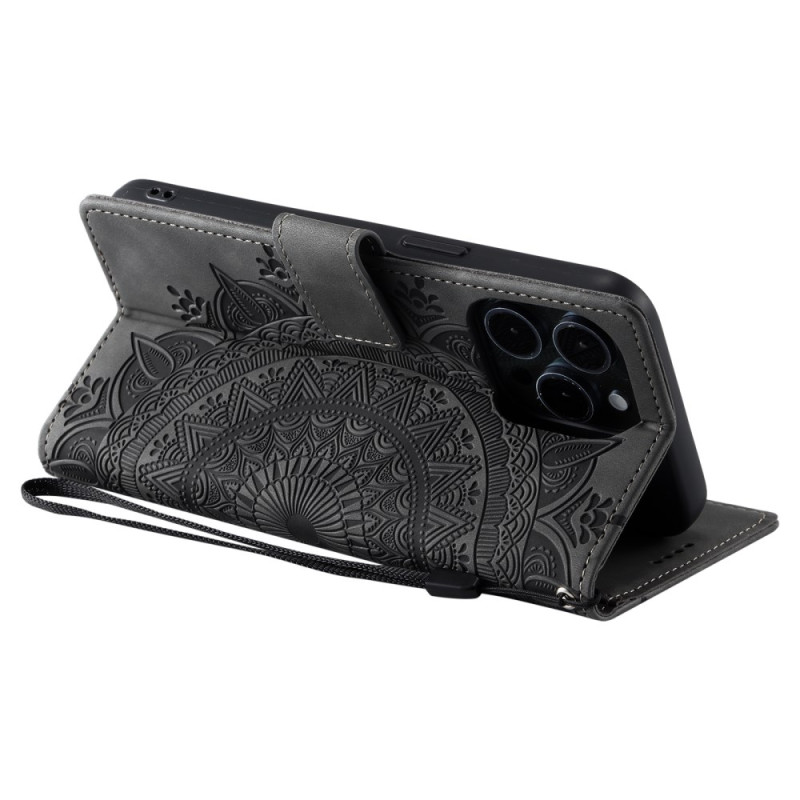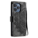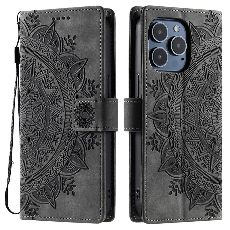 Elegante capa para carteira em pele PU com motivos de mandala impressos para iPhone 13 Pro Max. Inclui 3 ranhuras para cartões, compartimento para dinheiro, fecho magnético e uma prática correia de mão. Proteção total e função de suporte integrada.
