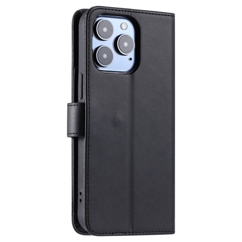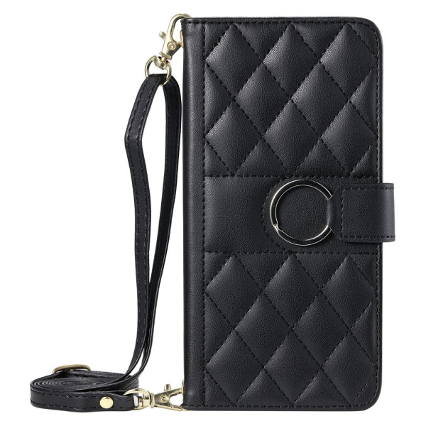 Capa elegante em pele PU para iPhone 13 Pro Max com um sofisticado padrão de diamante. Inclui um anel decorativo, 5 ranhuras para cartões, bolso para moedas e função de suporte. Fornecida com duas correias.