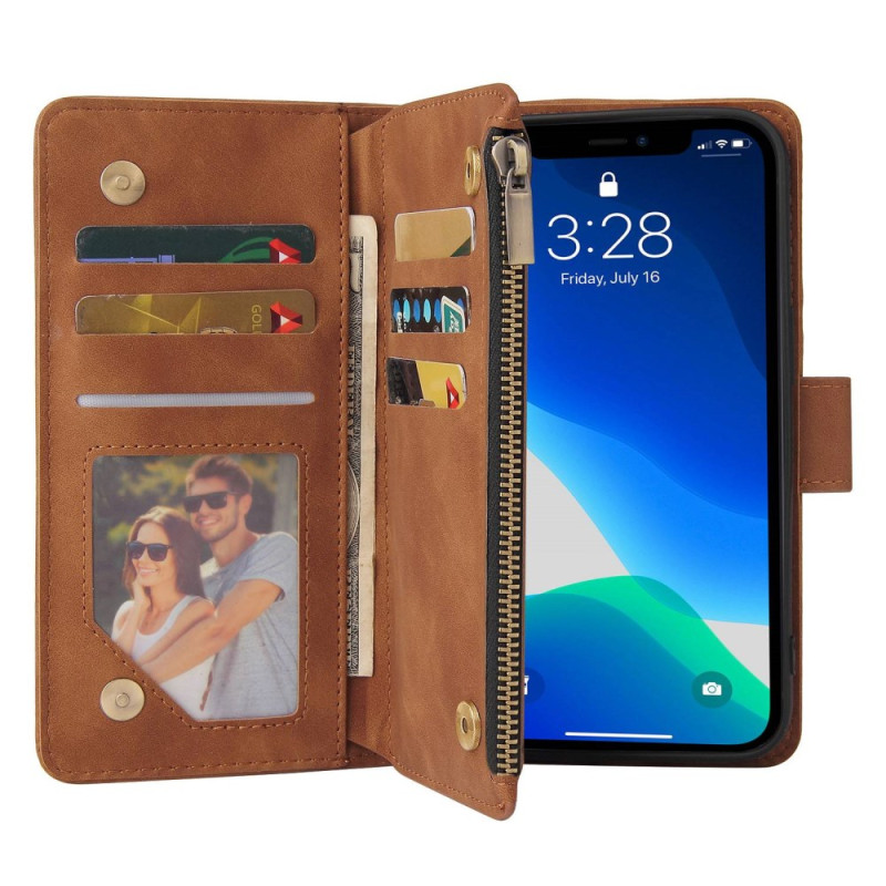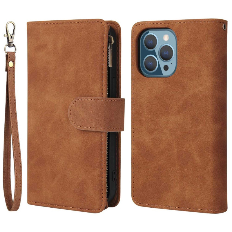 Étui portefeuille multifonctionnel pour iPhone 13 Pro Max alliant protection et praticité. Doté de multiples fentes pour cartes, d'un compartiment pour espèces et d'une poche zippée supplémentaire. La coque en TPU souple et cuir PU offre une protection optimale contre les chocs et les rayures.