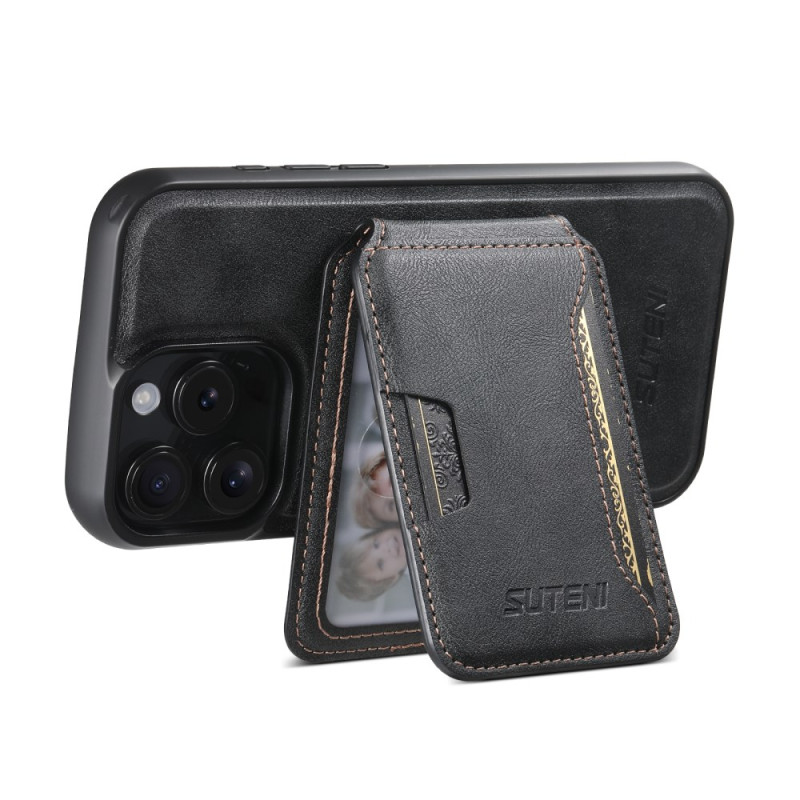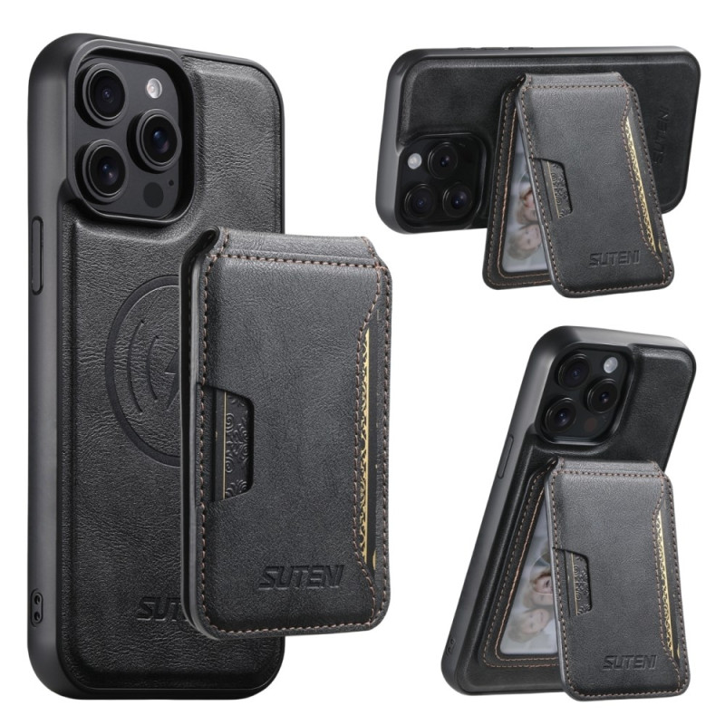 Capa magnética amovível 2 em 1 para iPhone 13 Pro com textura de pele. Compatível com MagSafe e suporte para cartões com 3 ranhuras integrado. Proteção completa contra choques e riscos com fixação magnética para suporte de automóvel.
