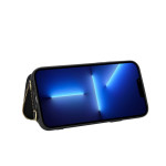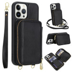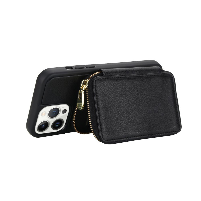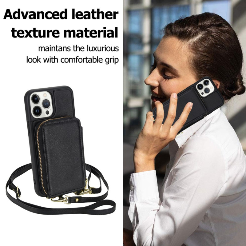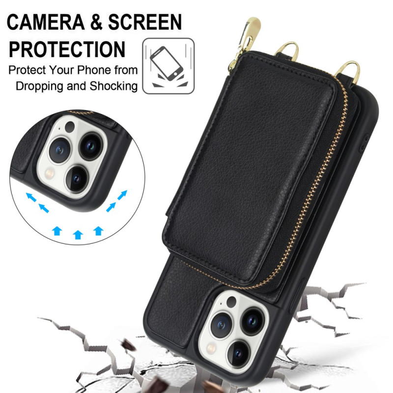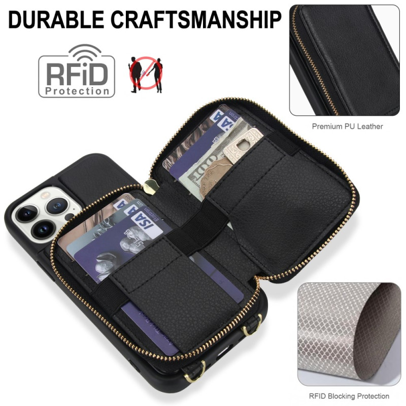 Capa de carteira 2 em 1 elegante e segura para iPhone 13 Pro. Proteção RFID integrada, fecho de correr para guardar cartões e dinheiro, função de suporte de vídeo e alça de ombro amovível para uma utilização quotidiana sem mãos.