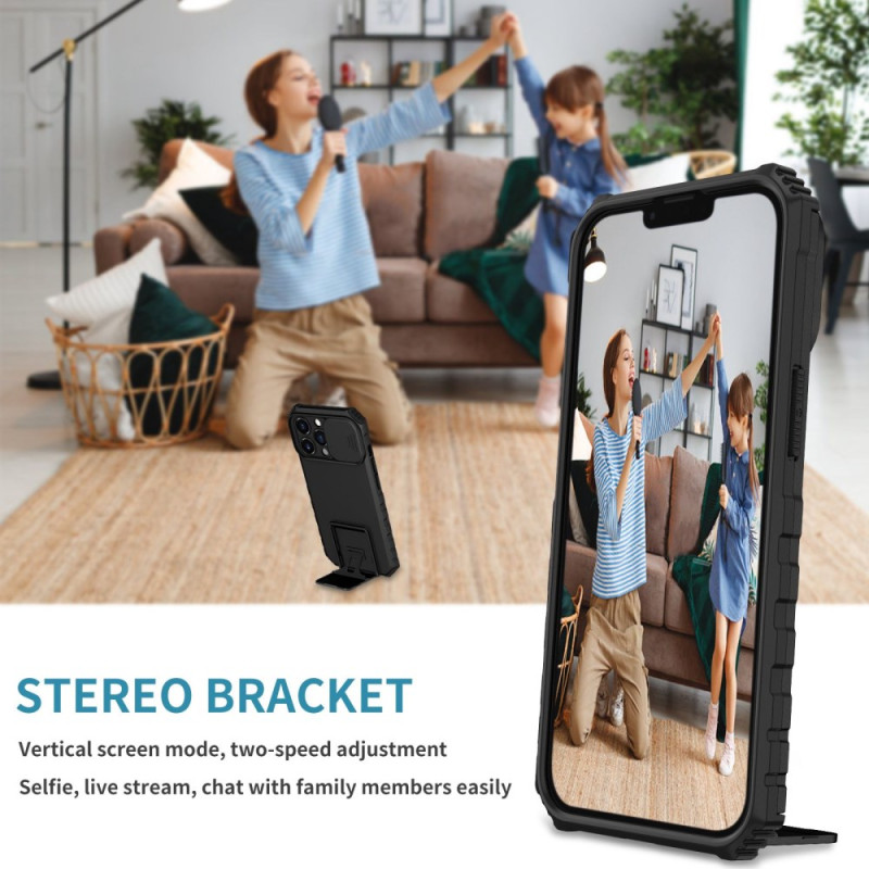 Proteja o seu iPhone 13 Pro com esta capa inovadora que inclui uma tampa deslizante para a câmara e um suporte vertical ajustável. O design de material duplo combina flexibilidade e rigidez para uma proteção óptima contra choques, riscos e pó.