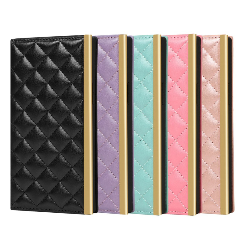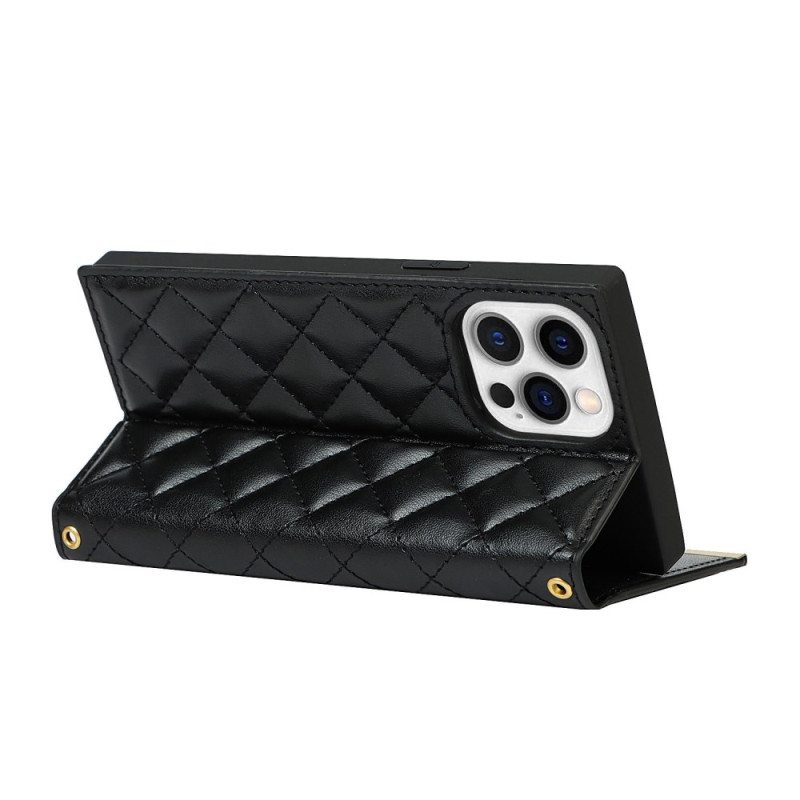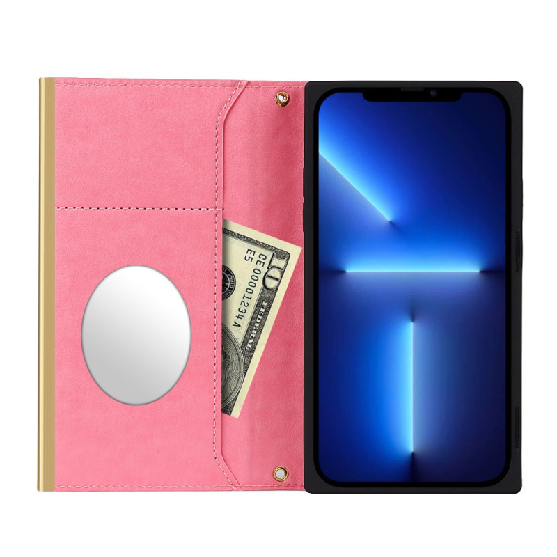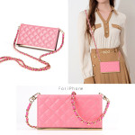 Capa multifunções elegante para telemóvel com uma sofisticada textura acolchoada. Inclui um espelho de maquilhagem integrado, um compartimento para dinheiro e um prático suporte mãos-livres. Inclui alças de ombro ajustáveis.