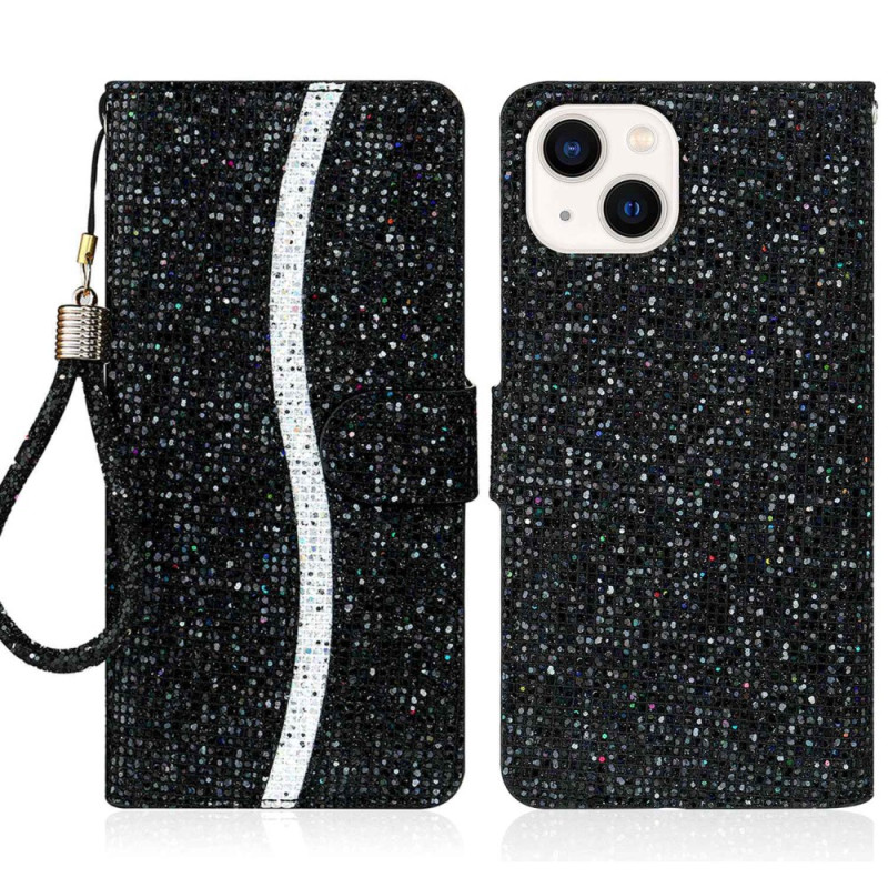 Estojo de couro PU brilhante para iPhone 14 Plus. Proteção de alta qualidade, design elegante, função de suporte e fecho magnético. Bolsos práticos para cartões e dinheiro. Alça incluída para facilitar o transporte.