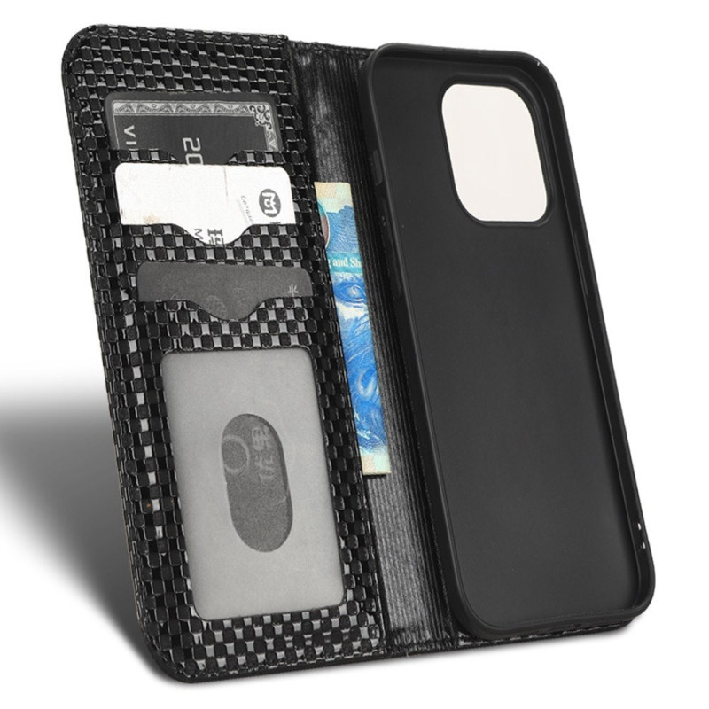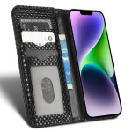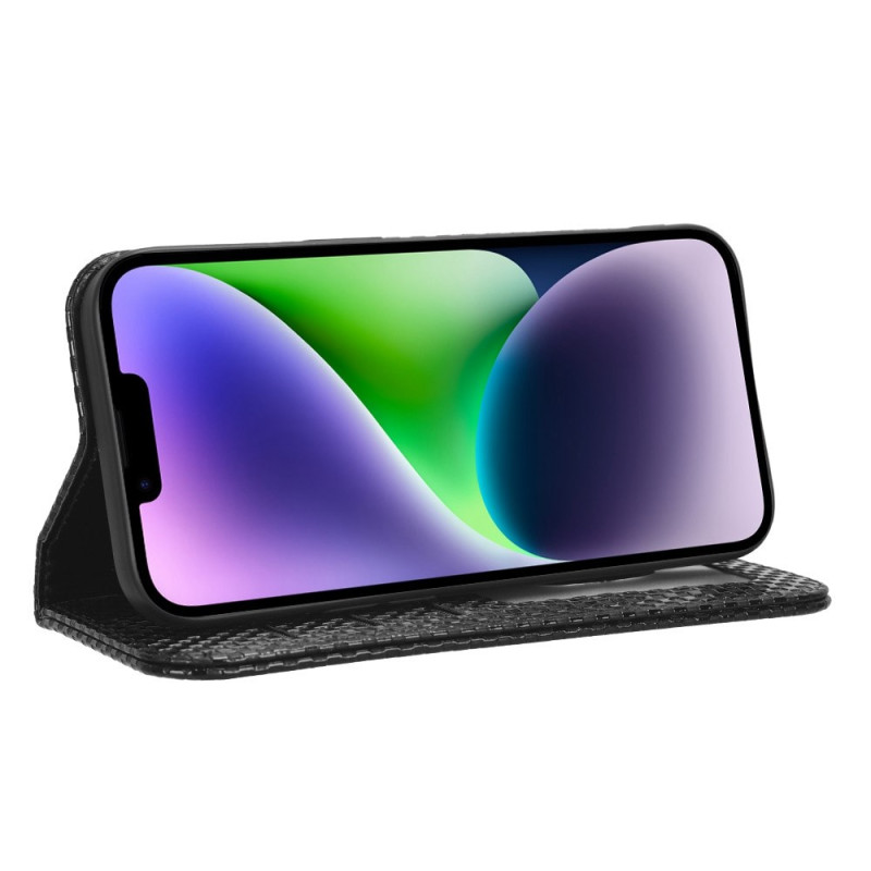Descubra a nossa capa de carteira magnética para iPhone 14 Plus. Combinando proteção contra impactos e funcionalidade, oferece um design elegante com uma textura de grelha. Possui compartimentos para cartões e notas, além de um suporte integrado para uma visualização confortável.