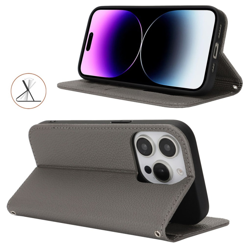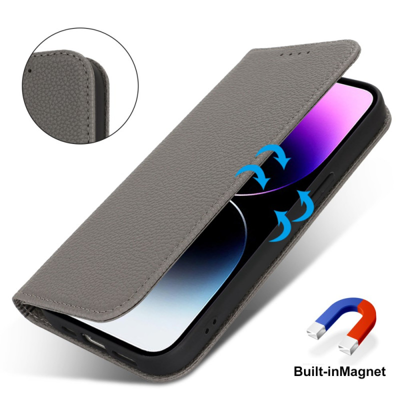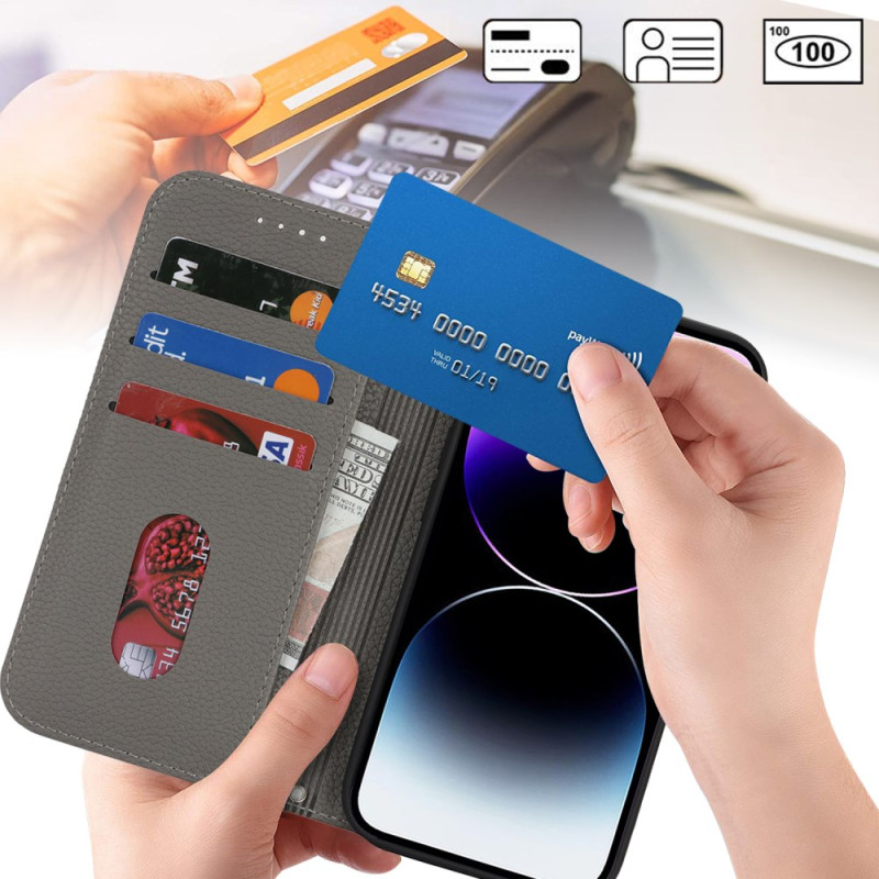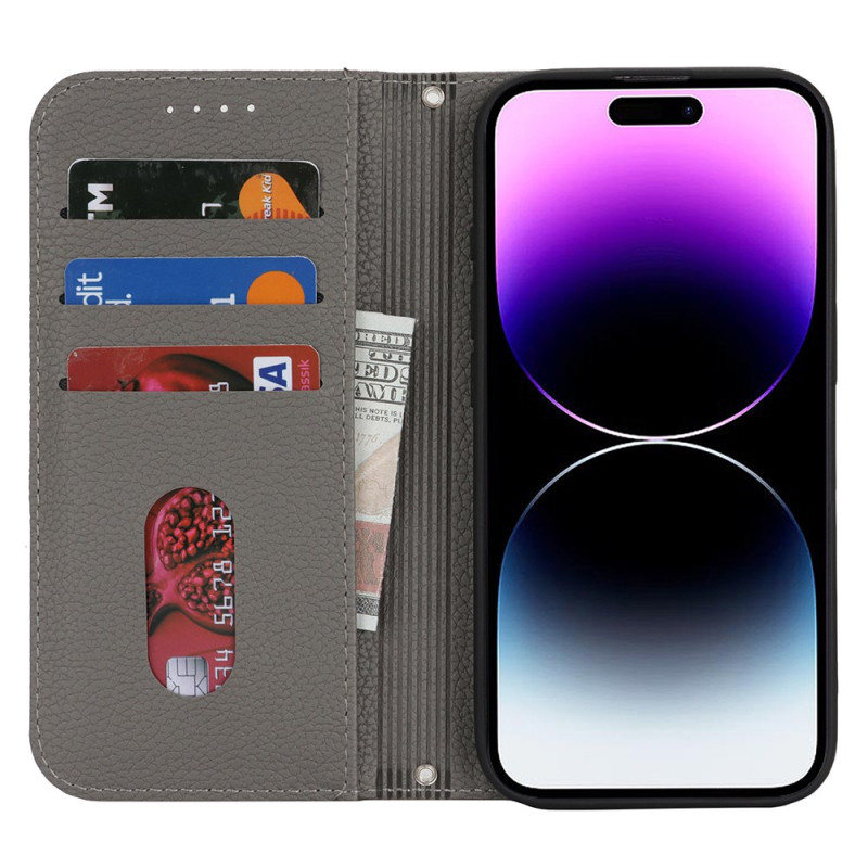 Descubra a nossa elegante capa de carteira para o iPhone 14 Pro Max. Fabricada em pele texturizada de alta qualidade, oferece uma arrumação prática para os seus cartões e dinheiro. Com o seu fecho magnético e a sua correia de pulso amovível, esta capa combina funcionalidade e proteção completa para o seu dispositivo.