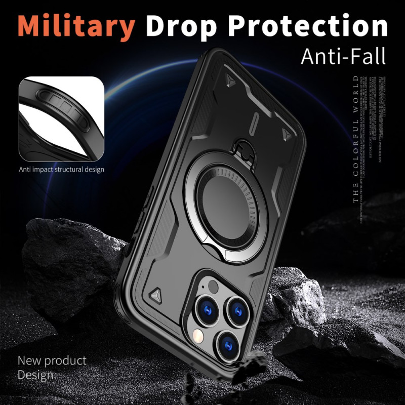 Proteja o seu iPhone 14 Pro Max com esta robusta capa militar em PC+TPU, compatível com MagSafe. Com um suporte rotativo de 360°, oferece proteção total contra choques e quedas, ao mesmo tempo que proporciona a melhor experiência de mãos livres.