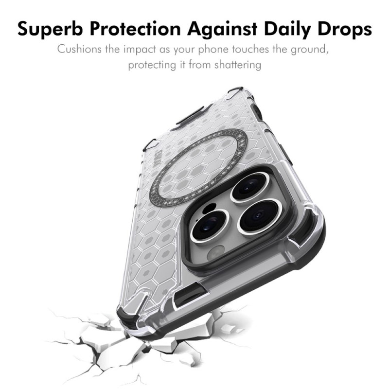 Proteção 2 em 1 completa para o seu iPhone 14 Pro Max: capa magnética com um elegante design em forma de favo de mel e protetor de ecrã em vidro temperado 9H. Compatível com MagSafe, resistente a choques e riscos para uma segurança óptima na utilização diária.