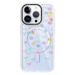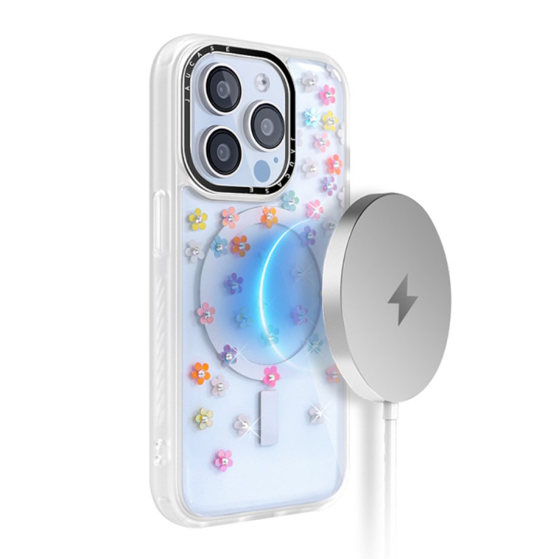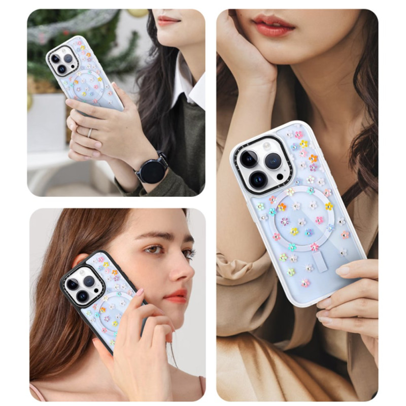 Proteja o seu iPhone 14 Pro Max com estilo com esta capa adornada com flores e strass brilhantes. Fabricada em PC e TPU, oferece uma proteção reforçada contra quedas de até 3 m, mantendo-se compatível com o carregamento MagSafe.