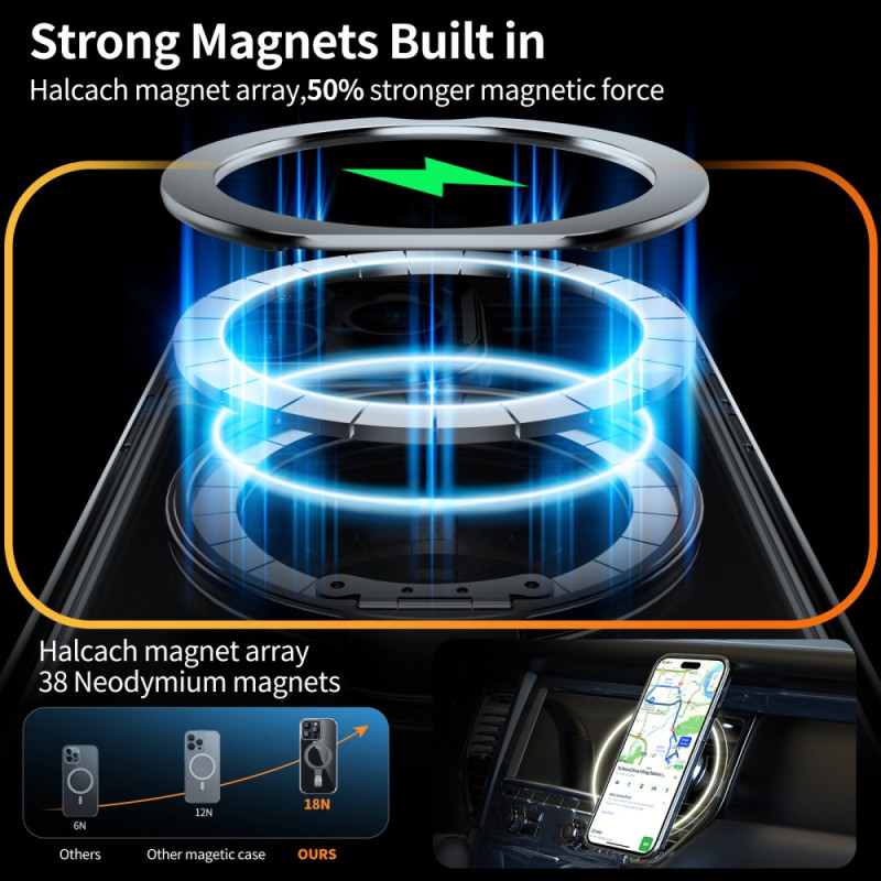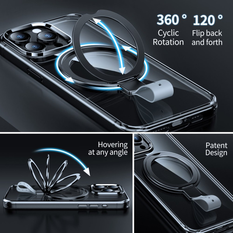 Capa de PC transparente de alta qualidade para iPhone 14 Pro Max. Suporte magnético rotativo de 360° integrado para uma visualização óptima em mãos-livres. Compatível com MagSafe com 38 ímanes de neodímio para uma força magnética superior. Proteção certificada contra quedas de nível militar.