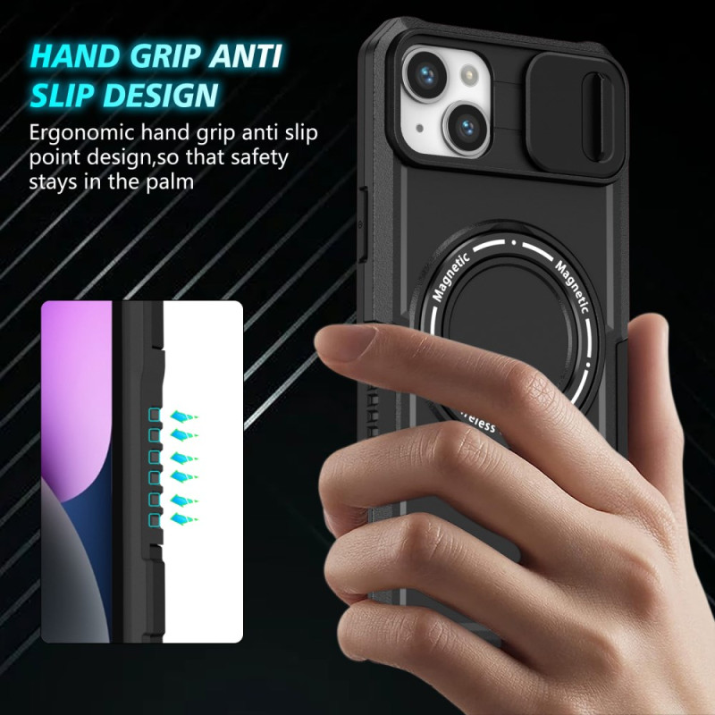 Descubra a nossa inovadora capa protetora para o iPhone 15 Plus. Com uma prática base de apoio, proteção da protecção para lente deslizante e compatibilidade MagSafe, oferece proteção de nível militar contra choques e permite o carregamento sem fios. Ideal para ver vídeos e facilitar a preensão.