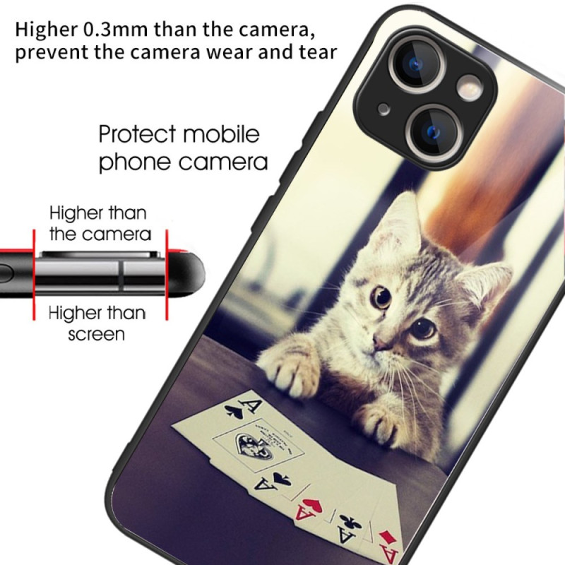 Descubra a nossa inovadora capa protetora para o iPhone 15 Plus. Combinando um rebordo em TPU macio com uma parte traseira em vidro temperado, oferece uma proteção multicamada contra quedas e riscos. O seu padrão de gato distinto dá um toque de estilo ao seu dispositivo. Com um rebordo elevado de 0,3 mm para proteger a protecção para lente da câmara e uma proteção reforçada de 360 graus, esta capa combina proteção e design.