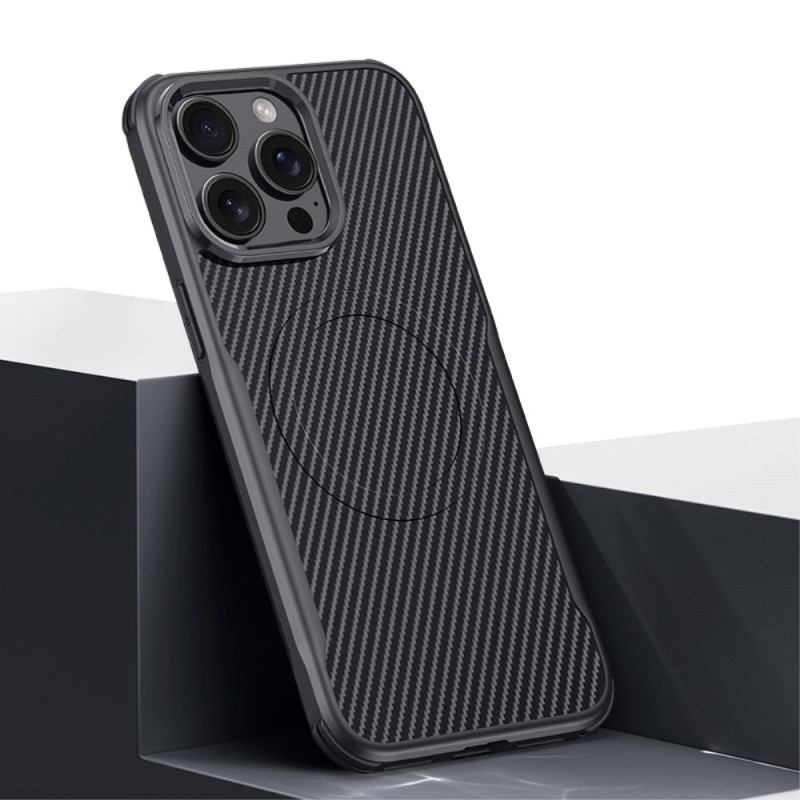 Descubra a nossa capa protetora topo de gama para o iPhone 15 Pro Max. Compatível com MagSafe, combina segurança e estilo com a sua textura em fibra de carbono. O seu material não agressivo para a pele, a resistência aos choques e a proteção contra a poluição fazem dela um acessório indispensável para o seu dispositivo.