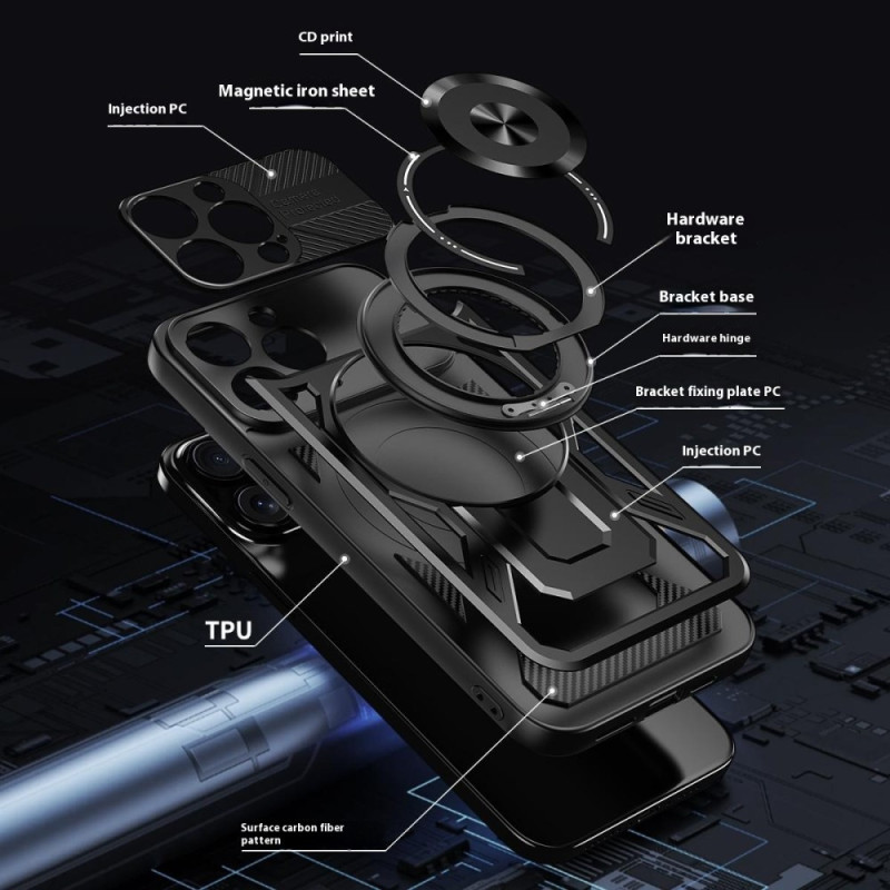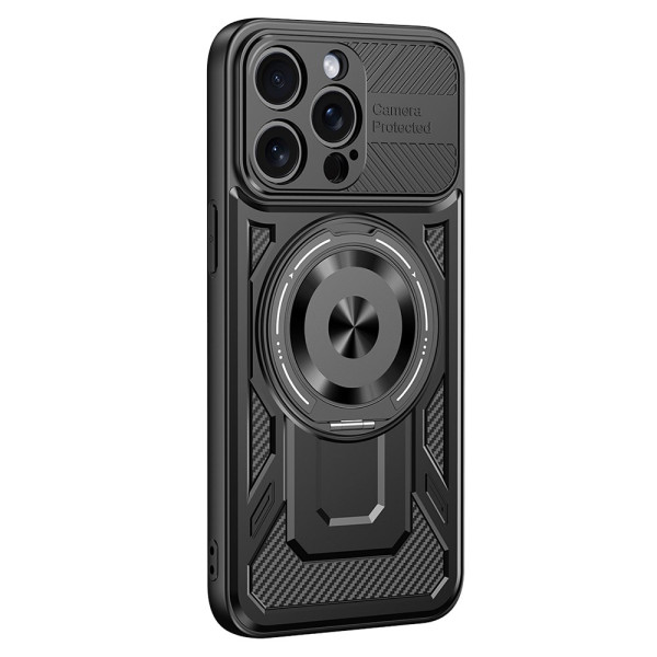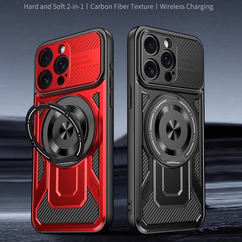 Descubra a nossa capa protetora definitiva para o iPhone 15 Pro. Com um suporte rotativo de 360° e compatibilidade MagSafe, oferece proteção de nível militar graças à sua dupla camada de TPU e PC. O seu design ergonómico com textura de carbono combina estilo e funcionalidade para uma utilização diária ideal.