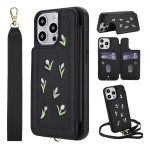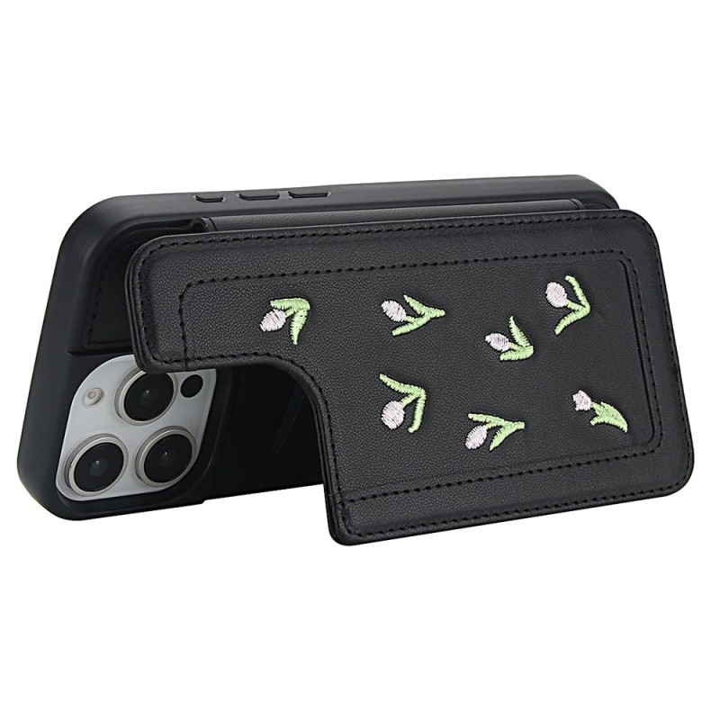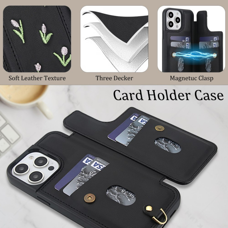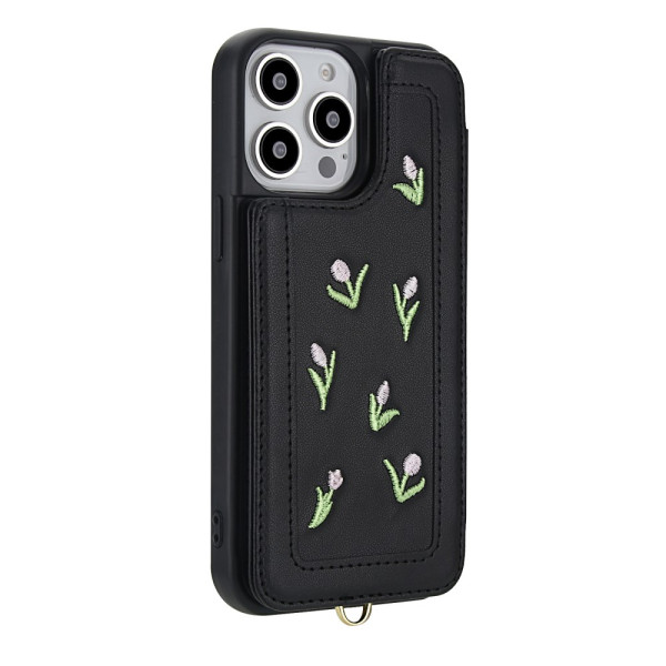 Descubra a nossa elegante capa para iPhone 15 Pro com bordado de tulipas. Fabricada em couro PU macio, oferece um prático suporte para cartões, função de apoio e proteção completa. Versátil, inclui uma alça de ombro ajustável e uma alça de mão para um transporte versátil.