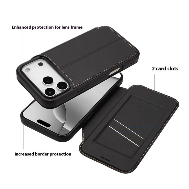 Elegante e funcional, a capa flip em pele para iPhone 17 Pro Max protege eficazmente o seu smartphone, conferindo-lhe um toque de requinte. A aba magnética protege o dispositivo e os seus cartões na perfeição, enquanto o revestimento interior em TPU absorve os choques e evita os riscos. No interior, duas ranhuras dedicadas permitem-lhe transportar cartões e objectos essenciais sem precisar de uma carteira. Discreta e prática, a capa também serve de suporte para mãos livres, para que possa desfrutar dos seus vídeos ou chamadas com todo o conforto.