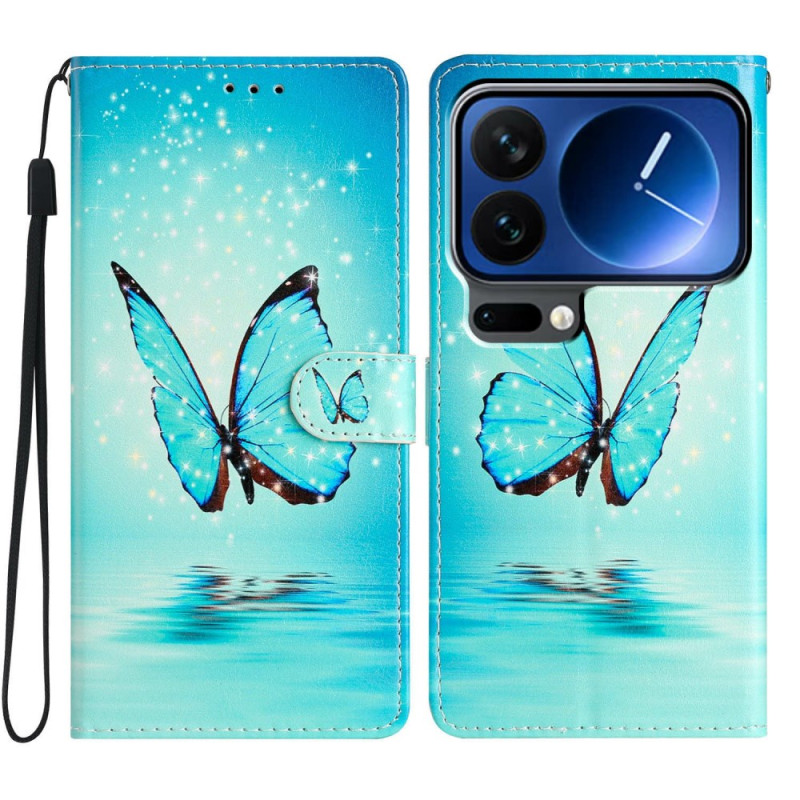 Descubra a nossa elegante capa de carteira para o Xiaomi 17 Pro Max. Com o seu motivo exclusivo de borboleta azul, combina estilo e funcionalidade. Fabricada em pele PU de alta qualidade, possui 3 ranhuras para cartões, um bolso para bilhetes, uma função de suporte e um fecho magnético. A correia de mão e o protetor da câmara proporcionam praticidade e segurança para a utilização diária.