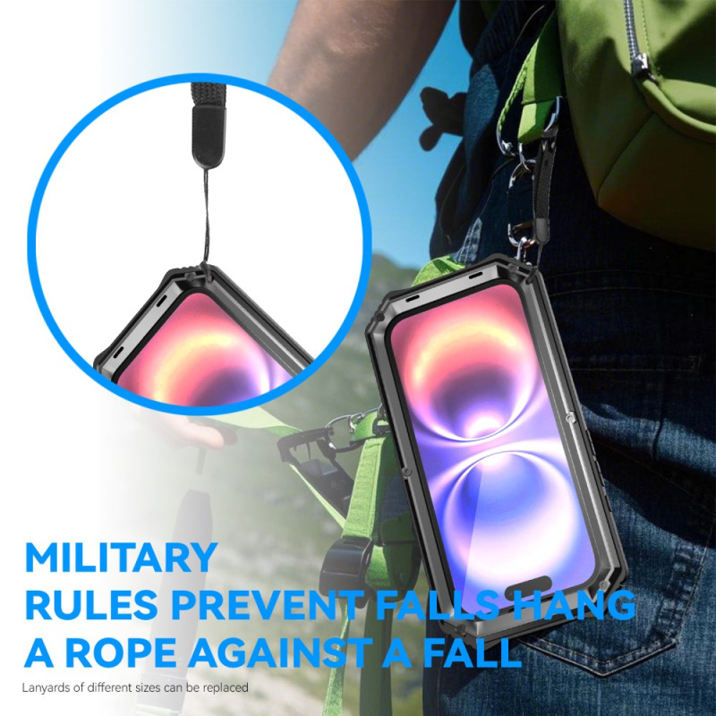 Concebida como uma armadura de várias camadas, a capa R-JUST funde plástico, silicone e metal para proporcionar ao iPhone 17 a melhor proteção. O escudo frontal incorpora um protetor de ecrã em vidro temperado, preservando a nitidez do ecrã e protegendo-o contra riscos. Com classificação IP54, é resistente ao pó e aos salpicos, proporcionando-lhe tranquilidade à chuva ou em ambientes adversos. Um suporte metálico discreto é ativado para uma visualização mãos-livres e a sua compatibilidade com o carregamento sem fios significa que pode ser utilizado sem esforço.