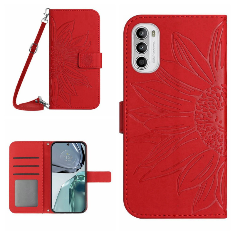O Moto G62 5G está perfeitamente seguro com uma capa Sunflower que vem com uma alça de ombro.