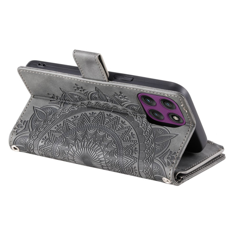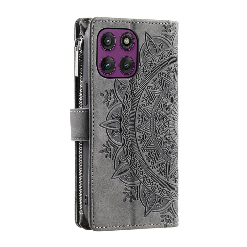Étui portefeuille élégant en cuir PU avec motif mandala pour Motorola Edge 70 5G. Comprend plusieurs emplacements pour cartes, une poche zippée, un support mains libres et une dragonne pratique. Protection complète alliant style et fonctionnalité.