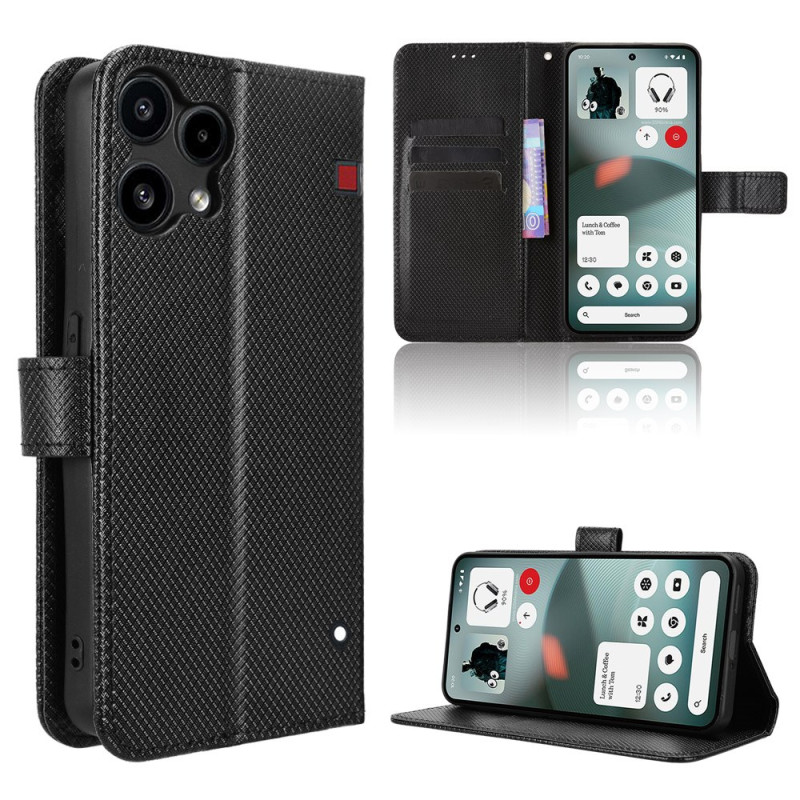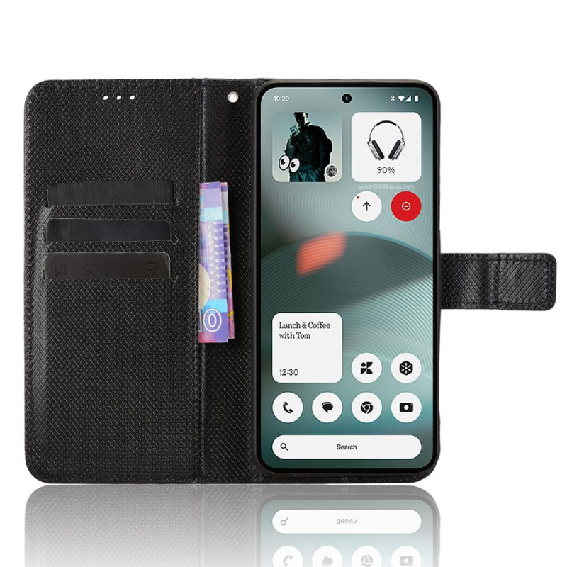 Proteja o seu Nothing Phone (3a) Lite 5G com estilo com esta capa para carteira em pele PU com textura de diamante. Com ranhuras para cartões, um bolso para notas, um suporte dobrável e uma prática correia de pulso para uma óptima utilização diária.