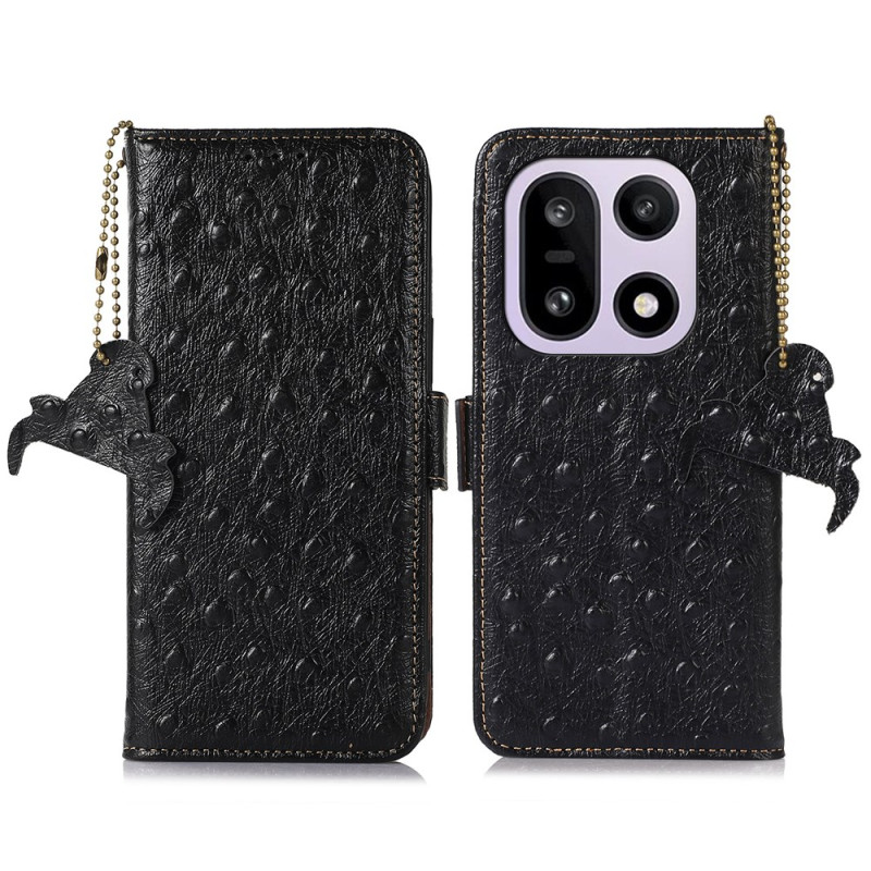 Descubra este elegante capa de carteira em pele de vaca genuína com textura de avestruz para o seu OnePlus 15 5G. Com tecnologia de bloqueio RFID, protege os seus cartões bancários e oferece uma arrumação prática com 2 ranhuras para cartões, 1 bolso para fotografias e 1 compartimento para dinheiro.