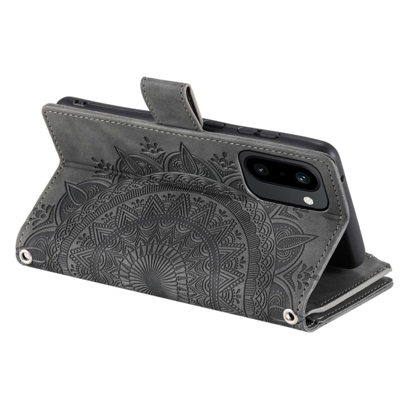 Elegante capa em pele PU para OnePlus 15R 5G com um requintado motivo mandala. Com várias ranhuras para cartões, um bolso com fecho de correr e uma prática alça de mão. Função de suporte integrada para utilização em mãos-livres e fecho magnético seguro.