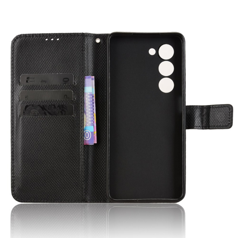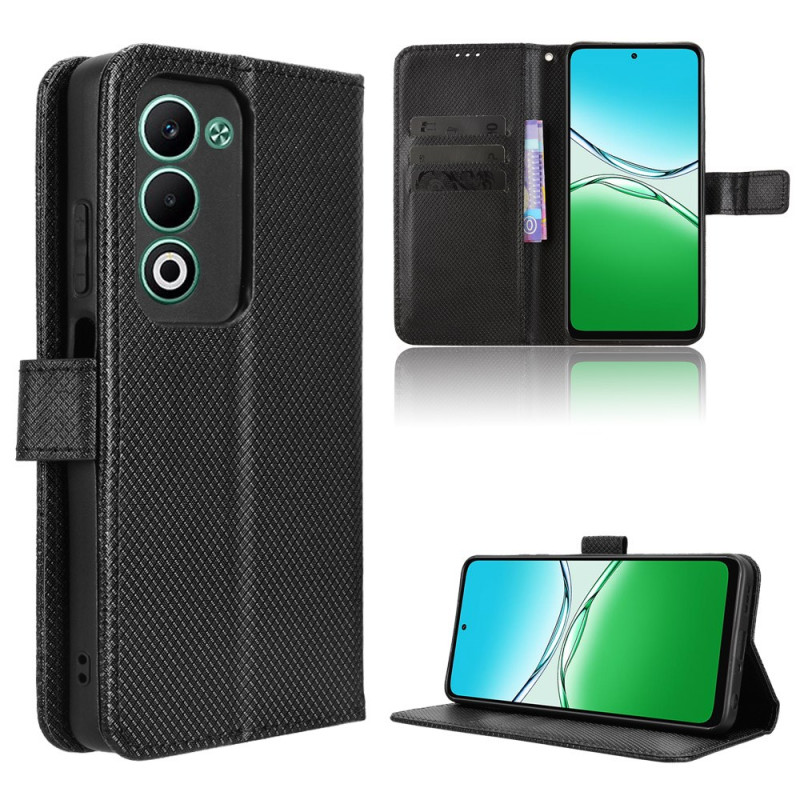 Capa elegante com textura de diamante para o seu Oppo A5 5G / 4G. Com compartimentos para cartões, bolso para dinheiro e uma prática correia de mão. Proteção total com suporte dobrável para uma visualização em mãos livres.