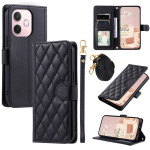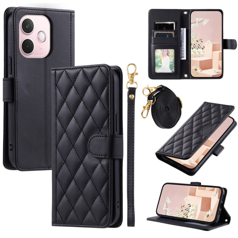 Capa de carteira elegante com padrão de diamante acolchoado para o Oppo A5 Pro 5G / 4G. Inclui bolsos para cartões, fecho magnético seguro e função de suporte. Inclui uma alça de ombro ajustável e uma alça de mão para um transporte cómodo.