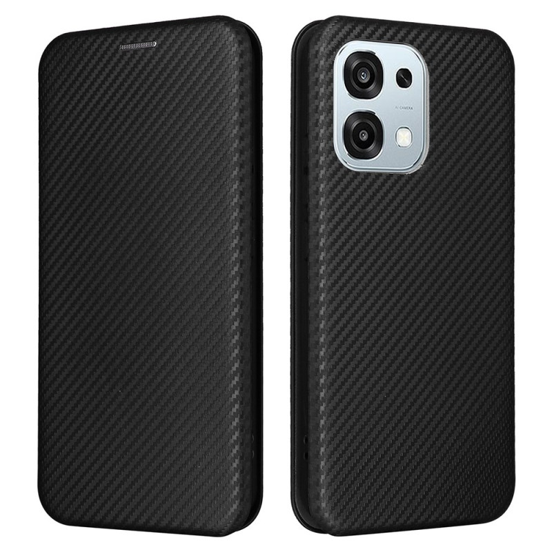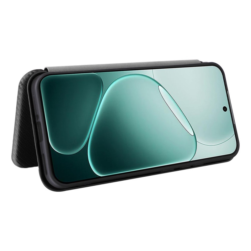 Capa elegante em pele PU com textura de fibra de carbono para o Oppo A6 Pro 5G. Proteção robusta de camada dupla contra choques e quedas. Inclui um suporte para cartões integrado e um fecho magnético seguro para maior comodidade no dia a dia.